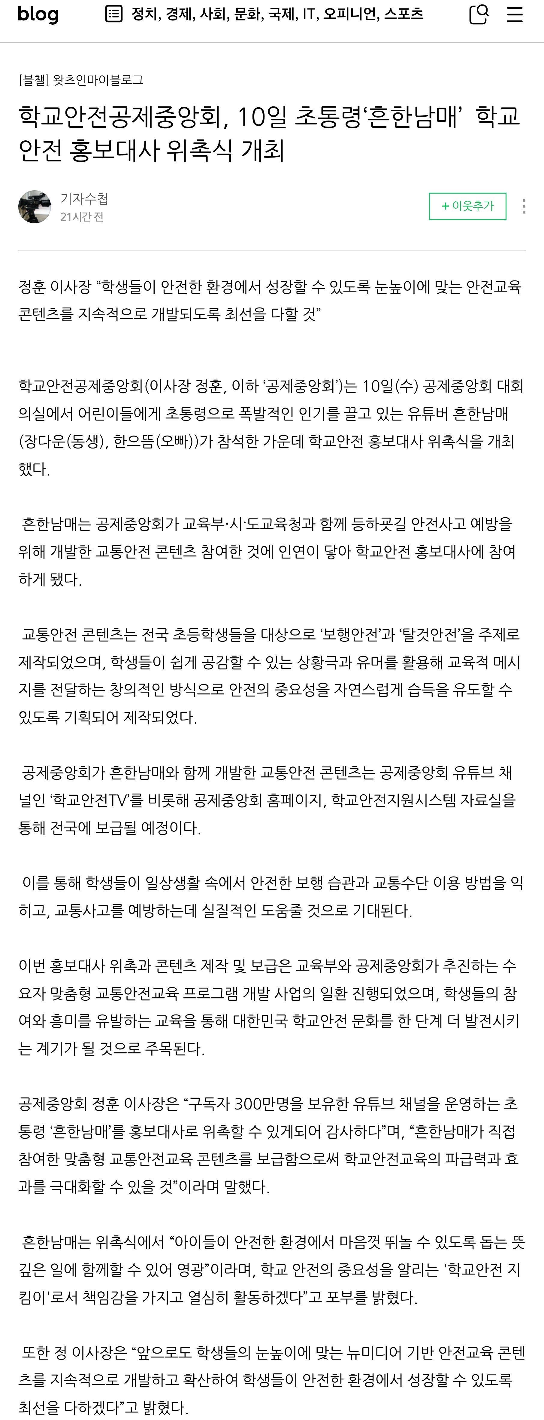□ [기자수첩] (2025.12.11.) 학교안전공제중앙회, 10일 초통령‘흔한남매’  학교안전 홍보대사 위촉식 개최 https://m.blog.naver.com/enhanok70/224105776742