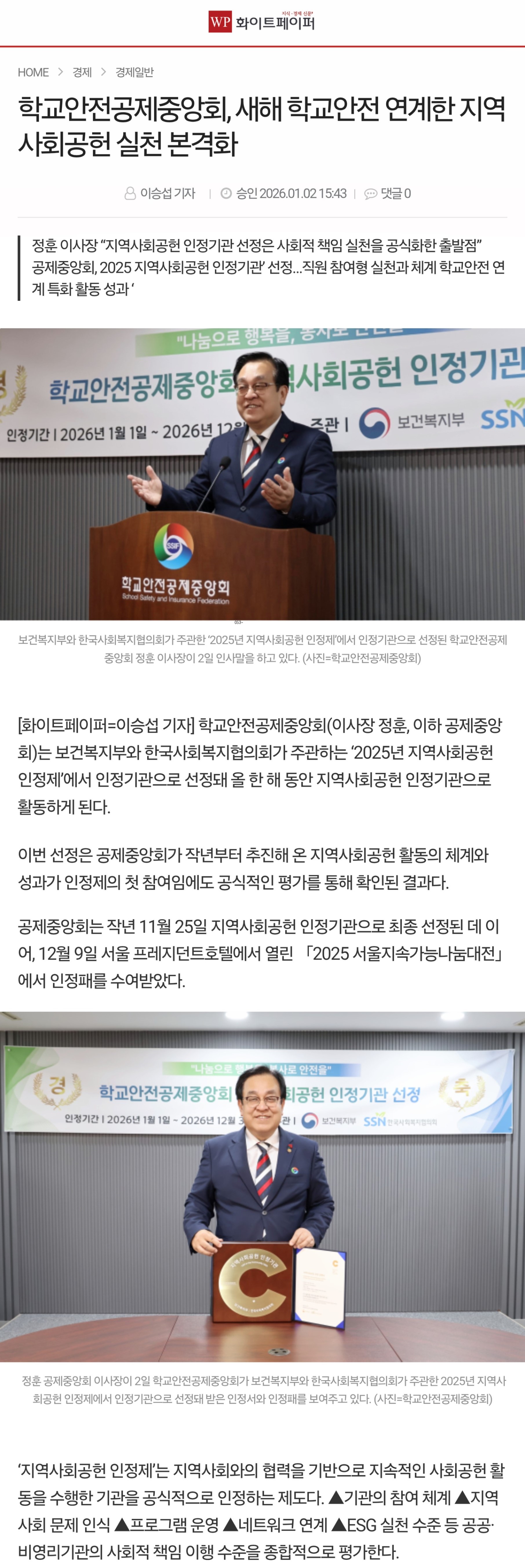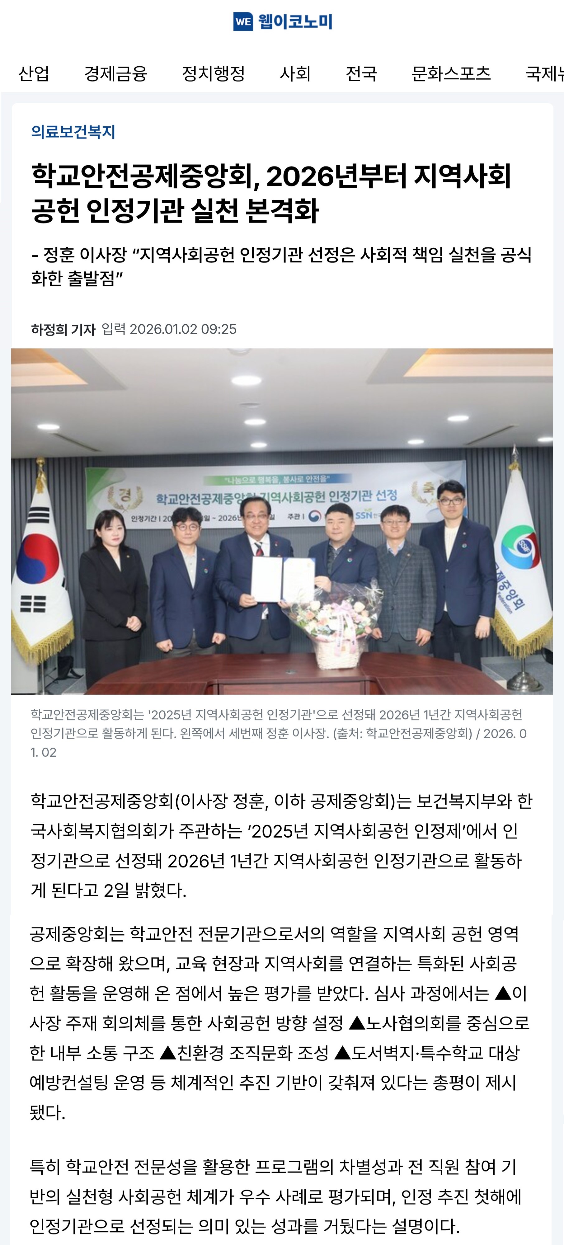 □ [웹이코노믹] (2026.1.2.) 학교안전공제중앙회, 2026년부터 지역사회공헌 인정기관 실천 본격화 https://www.webeconomy.co.kr/news/articleView.html?idxno=2045113