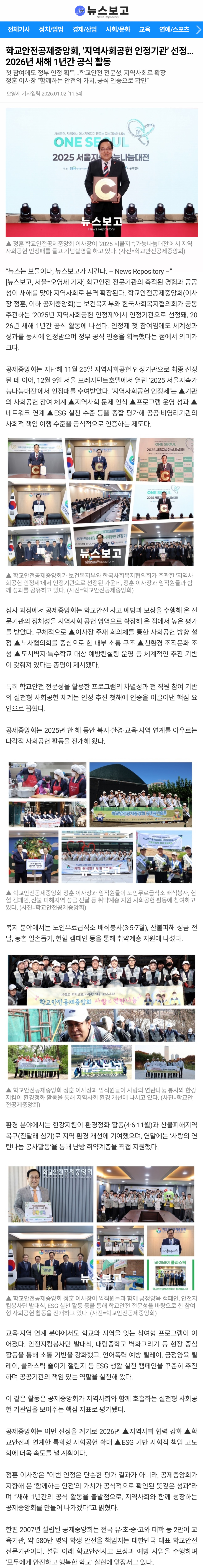 □ [에브리뉴스] (2026.1.2.) 학교안전공제중앙회, 2026년부터 지역사회공헌 인정기관 성과를 기반으로 학교안전 연계 지역사회공헌 실천 본격화 https://www.edupress.kr/news/articleView.html?idxno=21608