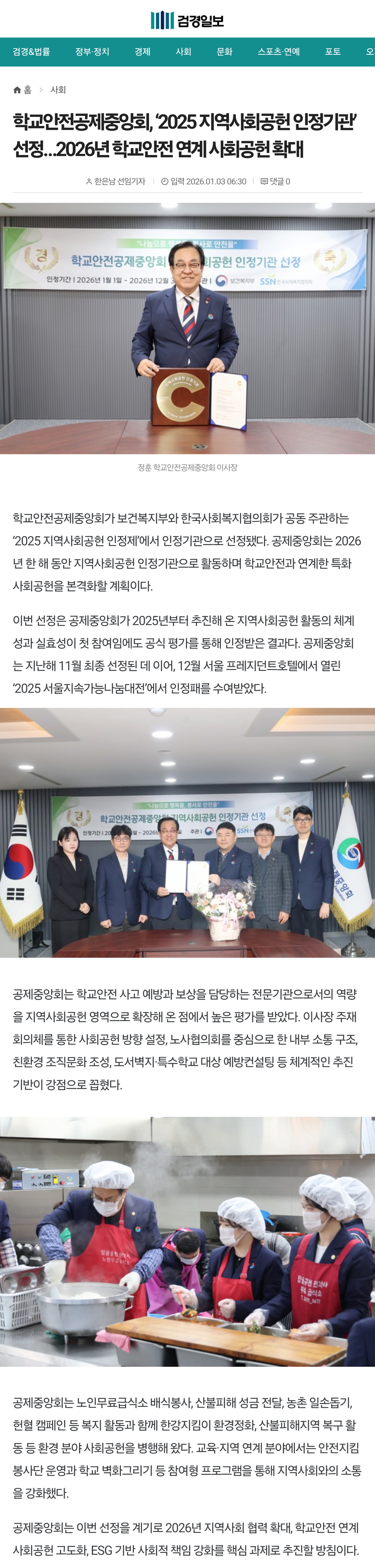 □ [검경일보] (2026.1.3.) 학교안전공제중앙회, ‘2025 지역사회공헌 인정기관’ 선정…2026년 학교안전 연계 사회공헌 확대 https://www.ppnews.kr/news/articleView.html?idxno=72111