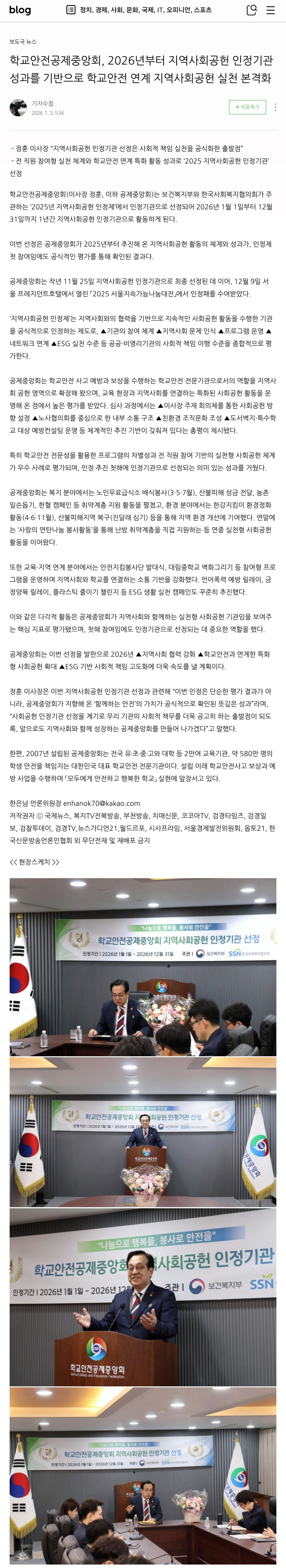 □ [기자수첩] (2026.1.3.) 학교안전공제중앙회, 2026년부터 지역사회공헌 인정기관 성과를 기반으로 학교안전 연계 지역사회공헌 실천 본격화 https://blog.naver.com/enhanok70/224132408364