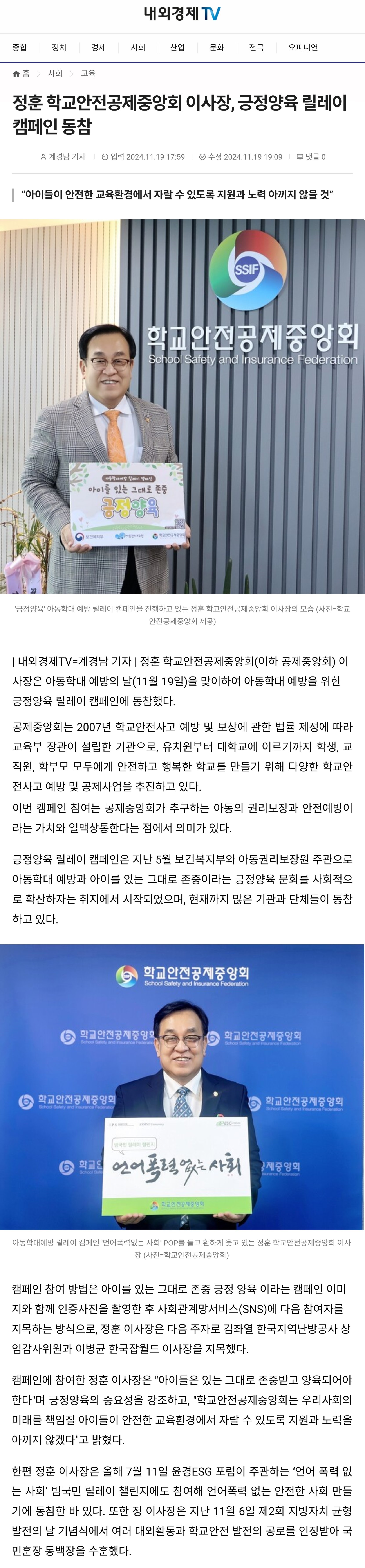 □ [내외경제TV] (2024.11.19.) 정훈 학교안전공제중앙회 이사장, 긍정양육 릴레이 캠페인 동참 https://www.nbntv.co.kr/news/articleView.html?idxno=3028391