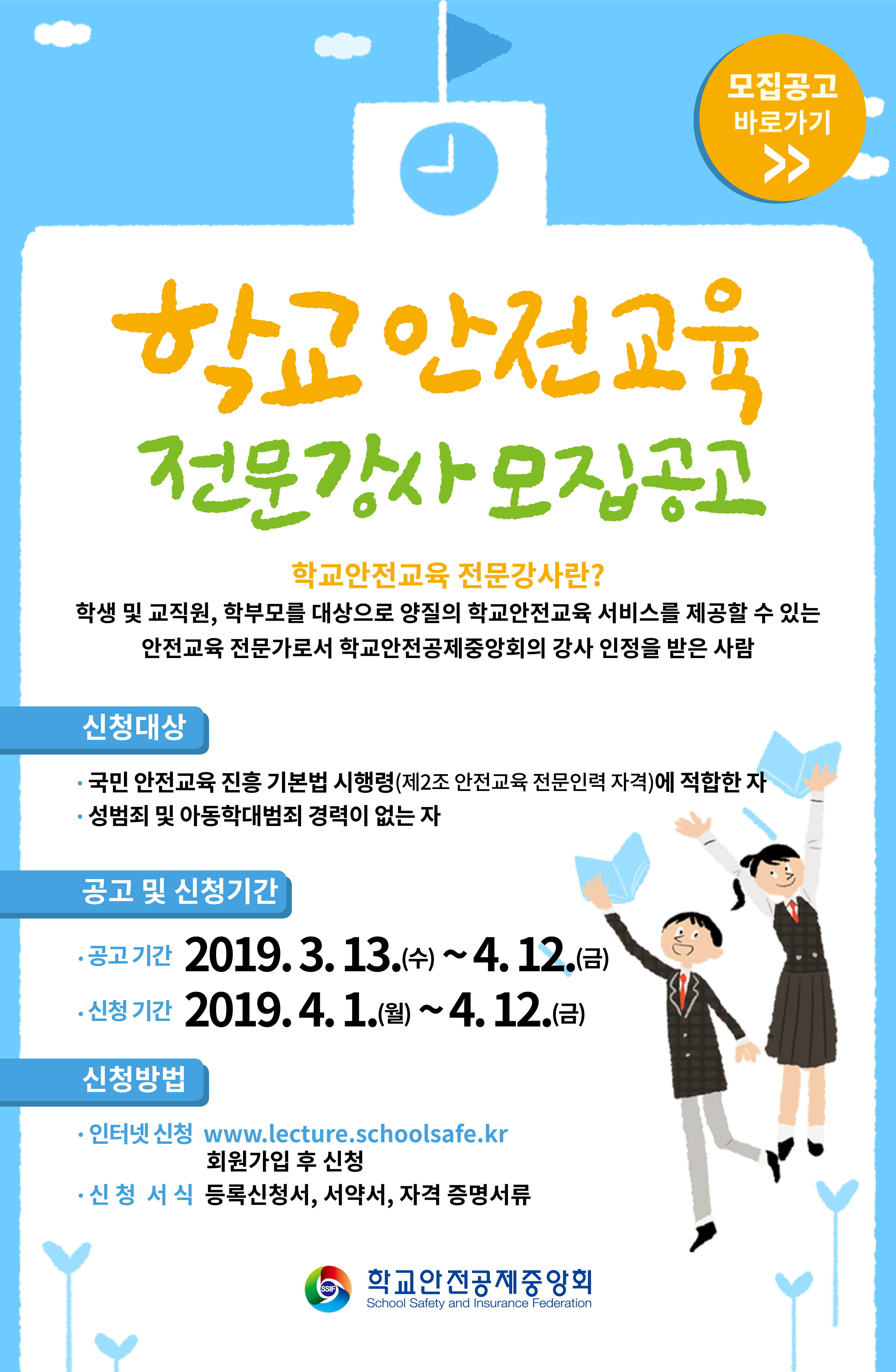 학교안전공제중앙회는 학생 및 교직원, 학부모를 대상으로 양질의 학교 안전교육을 제공할 수 있는 전문강사를 모집하고 있습니다.