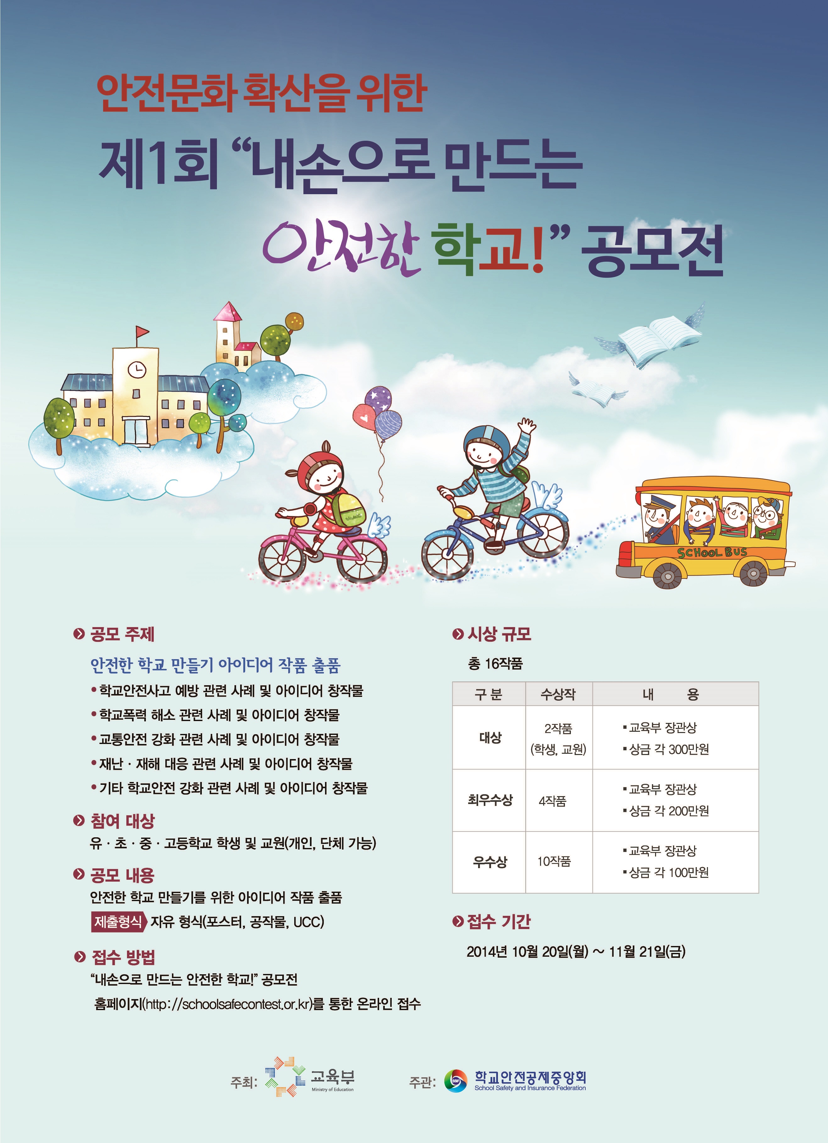제1회 ‘내손으로 만드는 안전한 학교!’ 공모전 가. 공모주제 : 안전한 학교 만들기 아이디어 작품 출품 ※ 포스터, 공작물, UCC(200MB 이하-5분 이내, 동영상) 등 자유형식 나. 주 최 : 교육부 다. 주 관 : 학교안전공제중앙회 라. 공모기간 : ‘14. 10. 20(월) ~ 11. 21(금) ※ 자세한 내용은 첨부파일 및 홈페이지(http://schoolsafecontest.or.kr) 참고