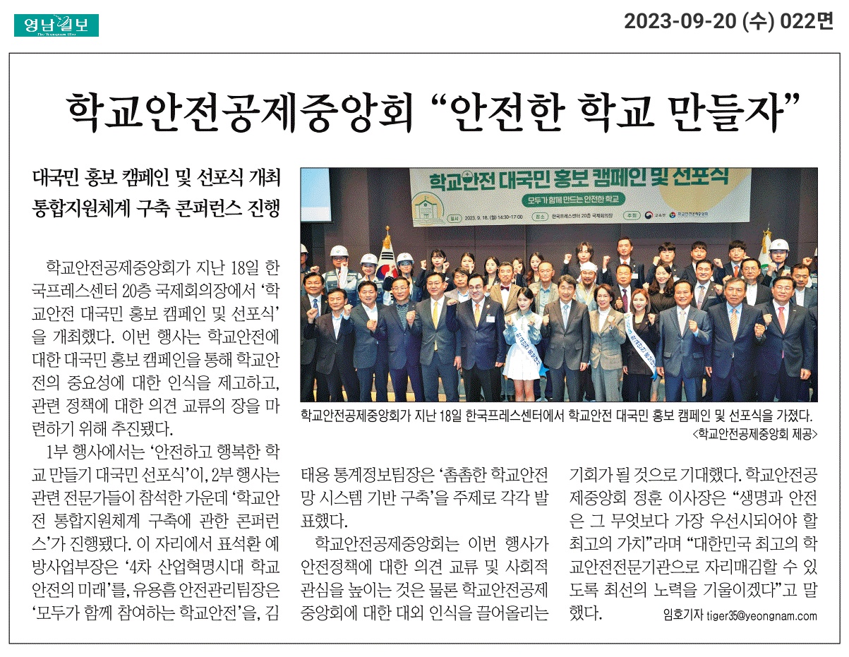 15) 영남일보 학교안전공제중앙회, 대국민 홍보 캠페인 및 선포식 개최 https://www.yeongnam.com/web/view.php?key=20230918010002237