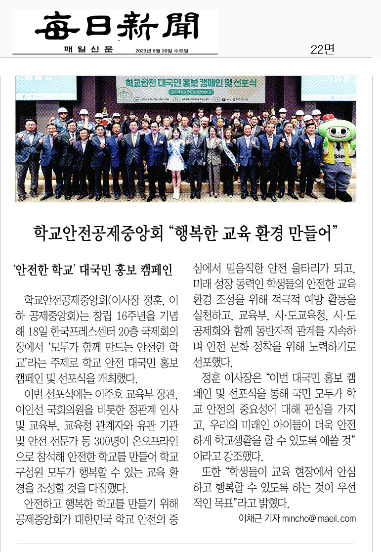 12) 매일신문 안전하고 행복한 학교, 학교안전공제중앙회가 책임집니다 https://news.imaeil.com/page/view/2023091918201728296