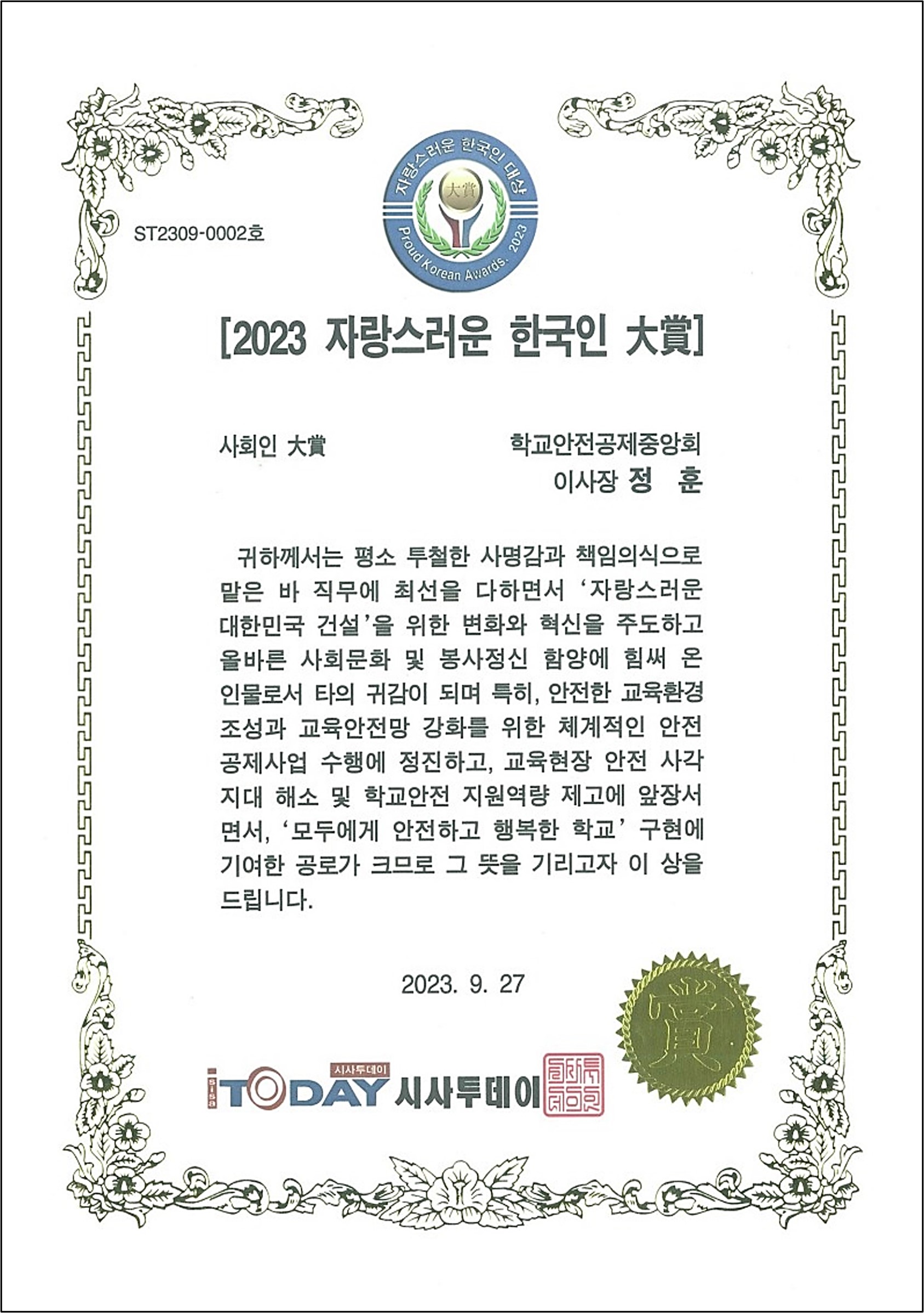 2023 자랑스러운 한국인 대상(시사투데이 2023.9.27.) 및 국제아동안전기구 세이프키즈코리아, 이사장 인터뷰 영상 입니다.