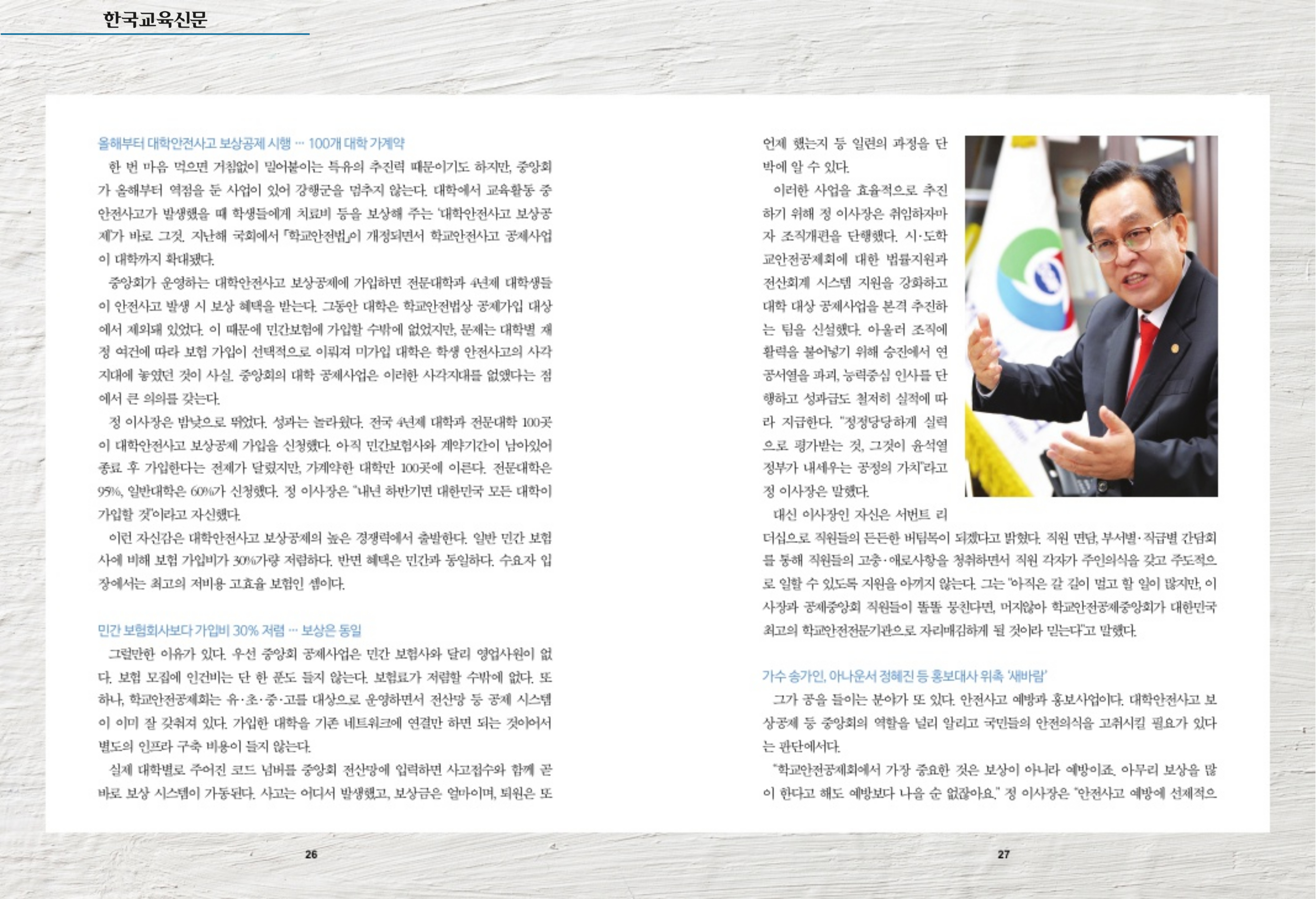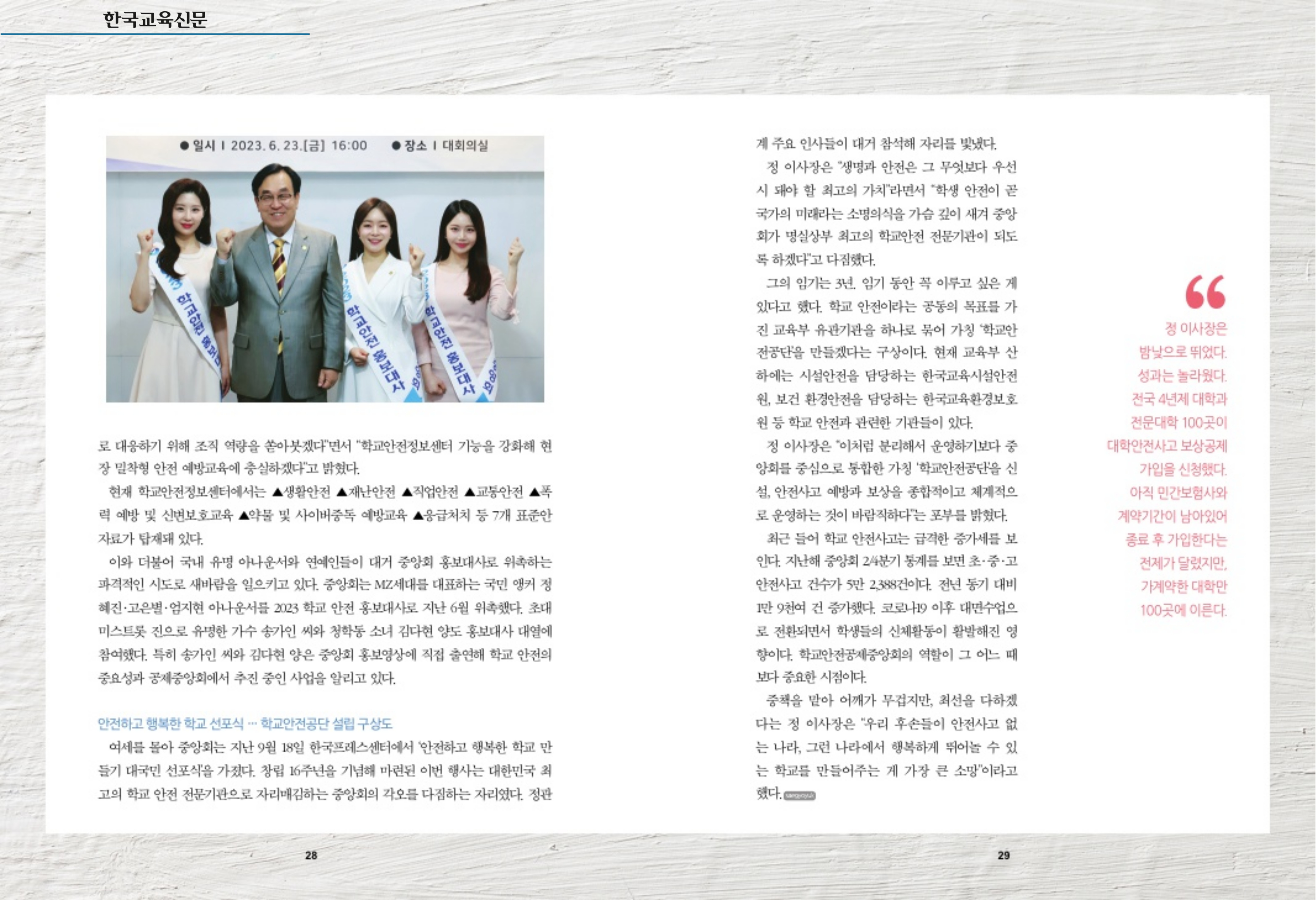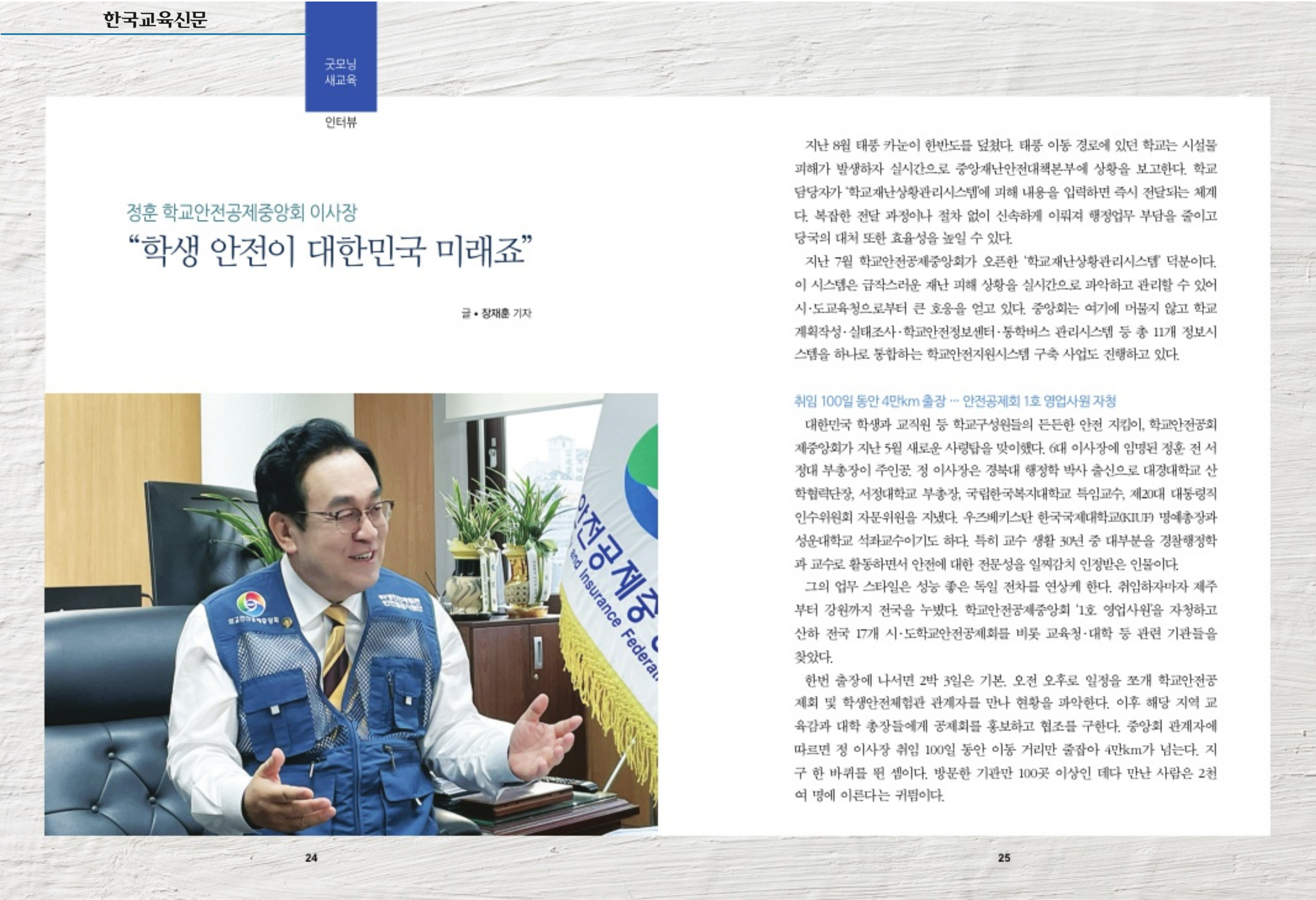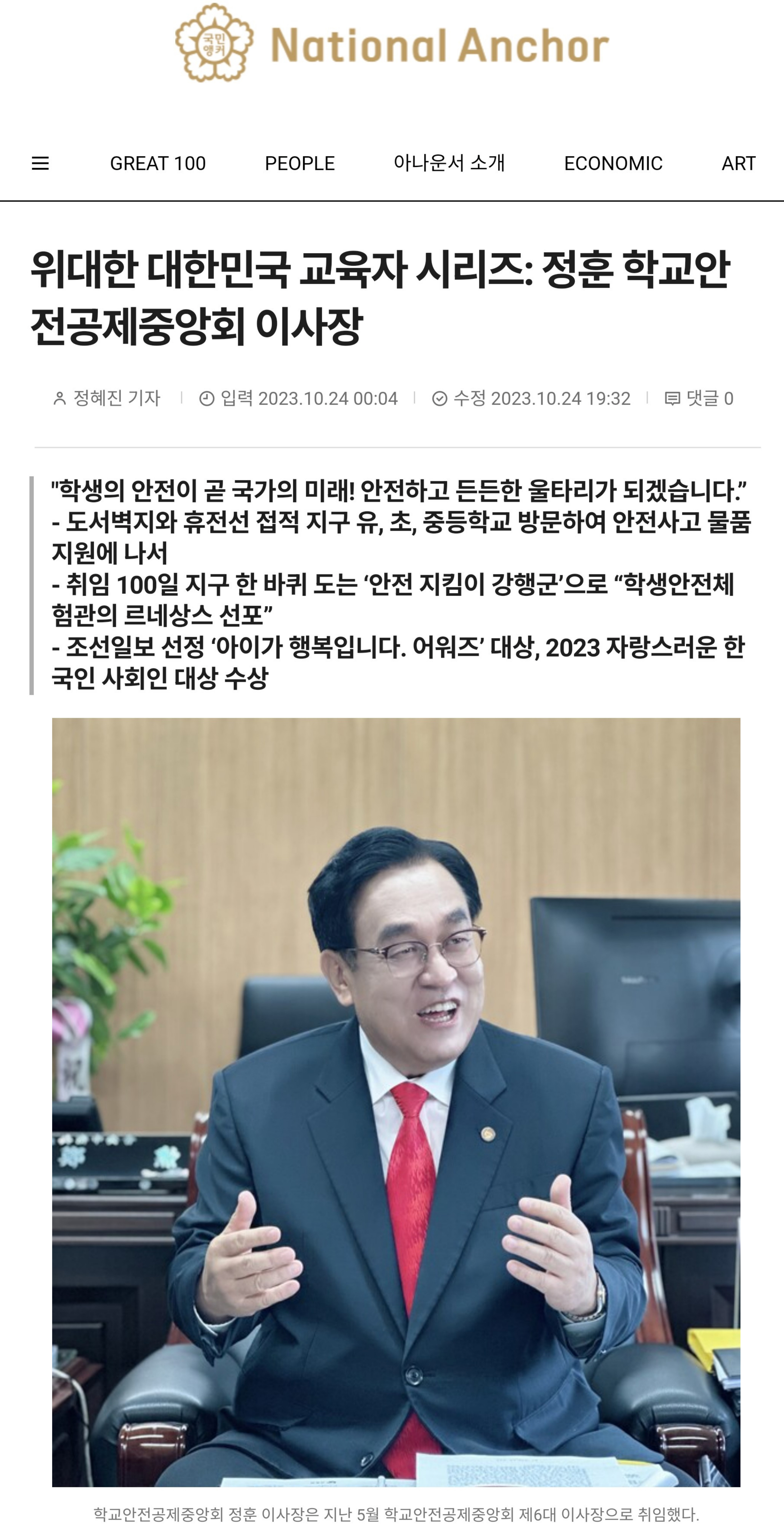 2. [국민앵커] (2023.10.24.) 매거진 11월호 표지 인물 국민앵커 위대한 대한민국 교육자 시리즈: 정훈 학교안전공제중앙회 이사장 : /notice/bodo/view/42762