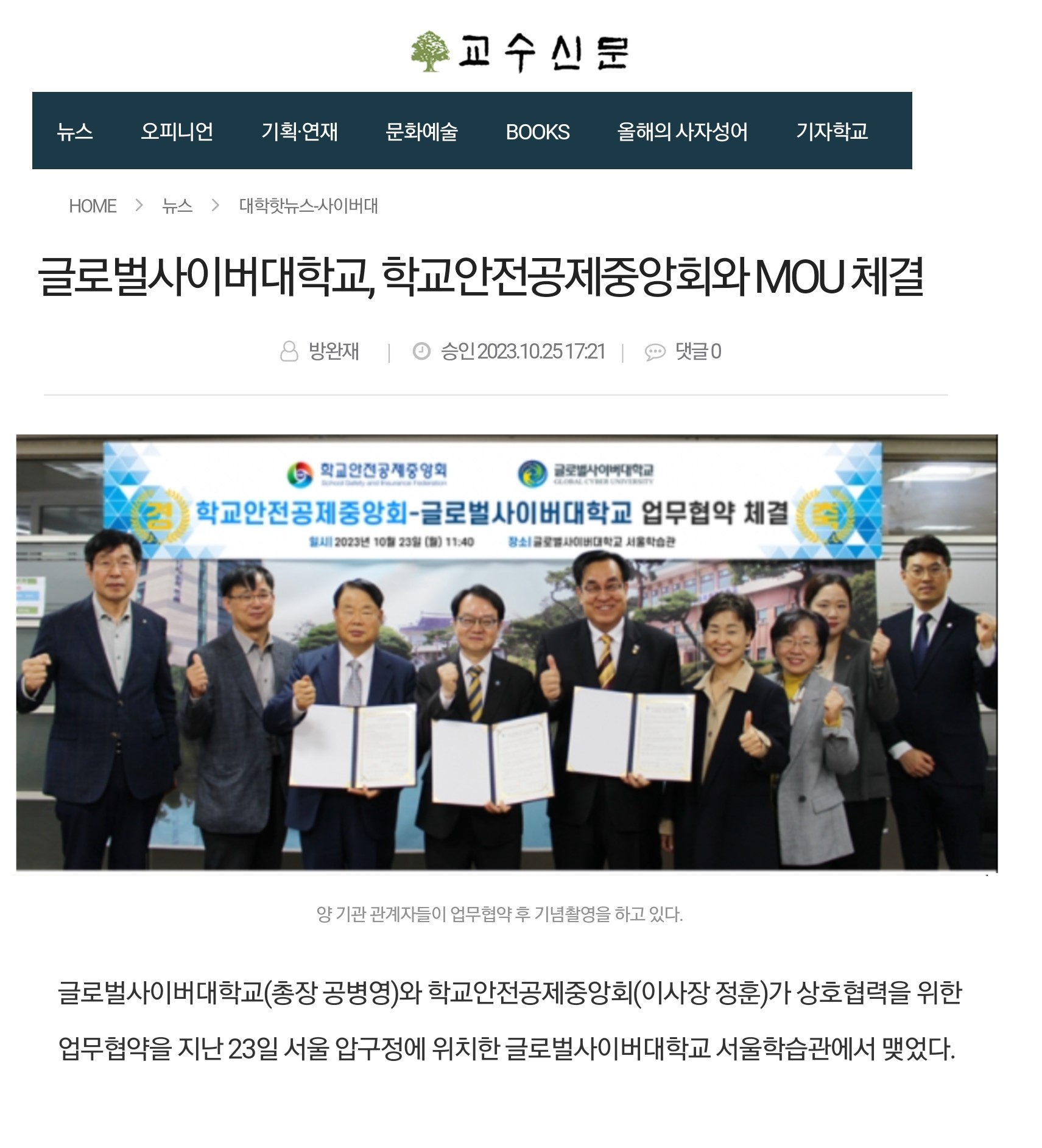 3. [교수신문] (2023.10.25.) 글로벌사이버대학교, 학교안전공제중앙회와 MOU 체결 : http://www.kyosu.net/news/articleView.html?idxno=111129