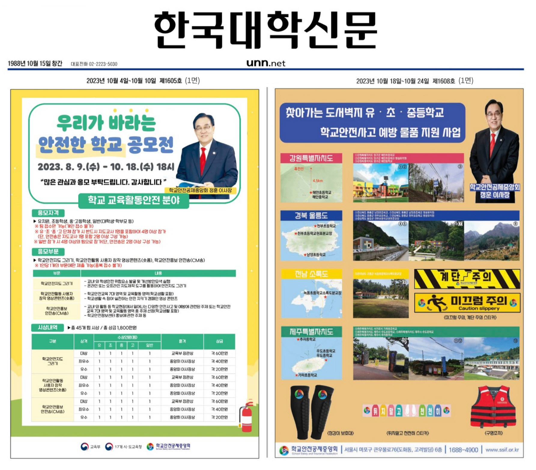 - (2023.10.04.) 우리가 바라는 안전한 학교 공모전 : 지면신문 1면 및 (2023.10.18.) 찾아가는 도서벽지 유·초·중등학교 학교안전사고 예방 물품 지원 사업 : 지면신문 1면