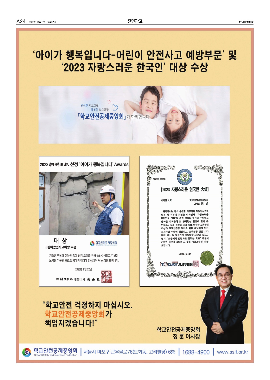 - (2023.10.11.) '아이가 행복입니다-어린이 안전사고 예방부분' 및 '2023 자랑스러운 한국인' 대상 수상 : 지면신문 24면