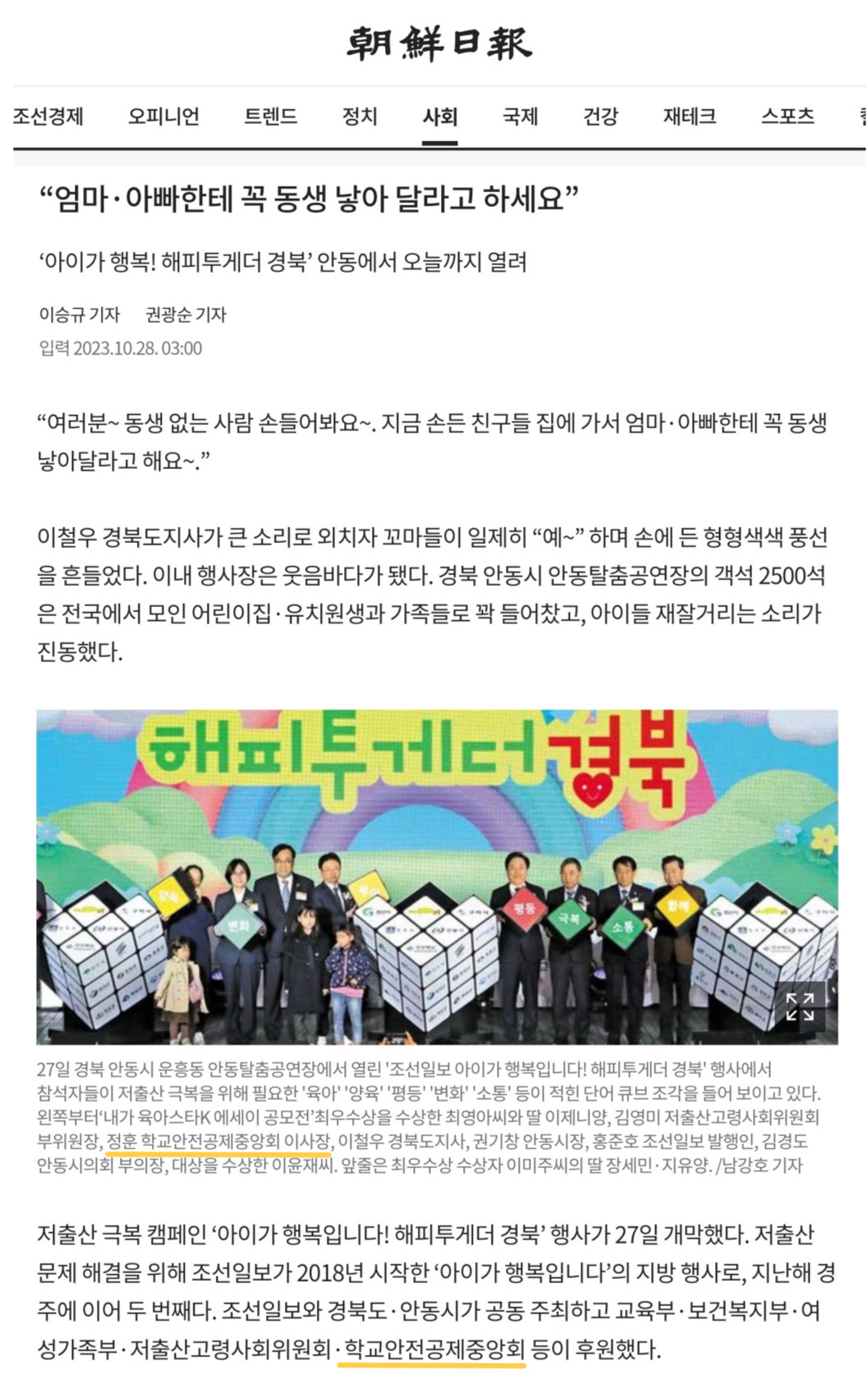 4. [조선일보] (2023.10.28.) “엄마·아빠한테 꼭 동생 낳아 달라고 하세요”(해피투게더 경북) : https://www.chosun.com/national/regional/2023/10/28/D33SNUW7TFADZF2IEJFZ2VR6AE/?utm_source=naver&utm_medium=referral&utm_campaign=naver-news