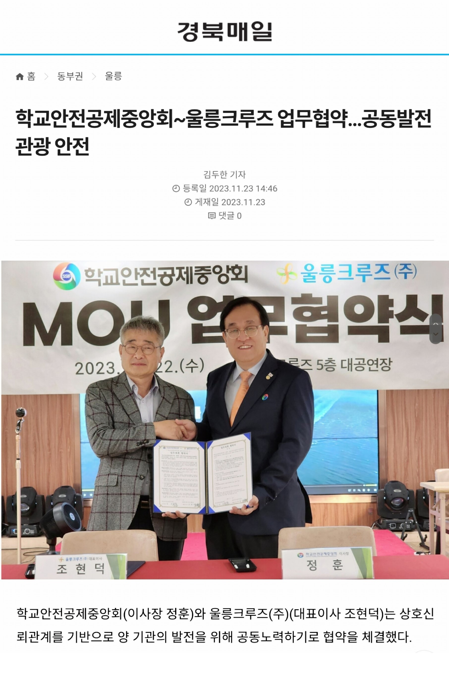 ○ (2023.11.23.) 학교안전공제중앙회~울릉크루즈 업무협약…공동발전 관광 안전 http://www.kbmaeil.com/news/articleView.html?idxno=975878