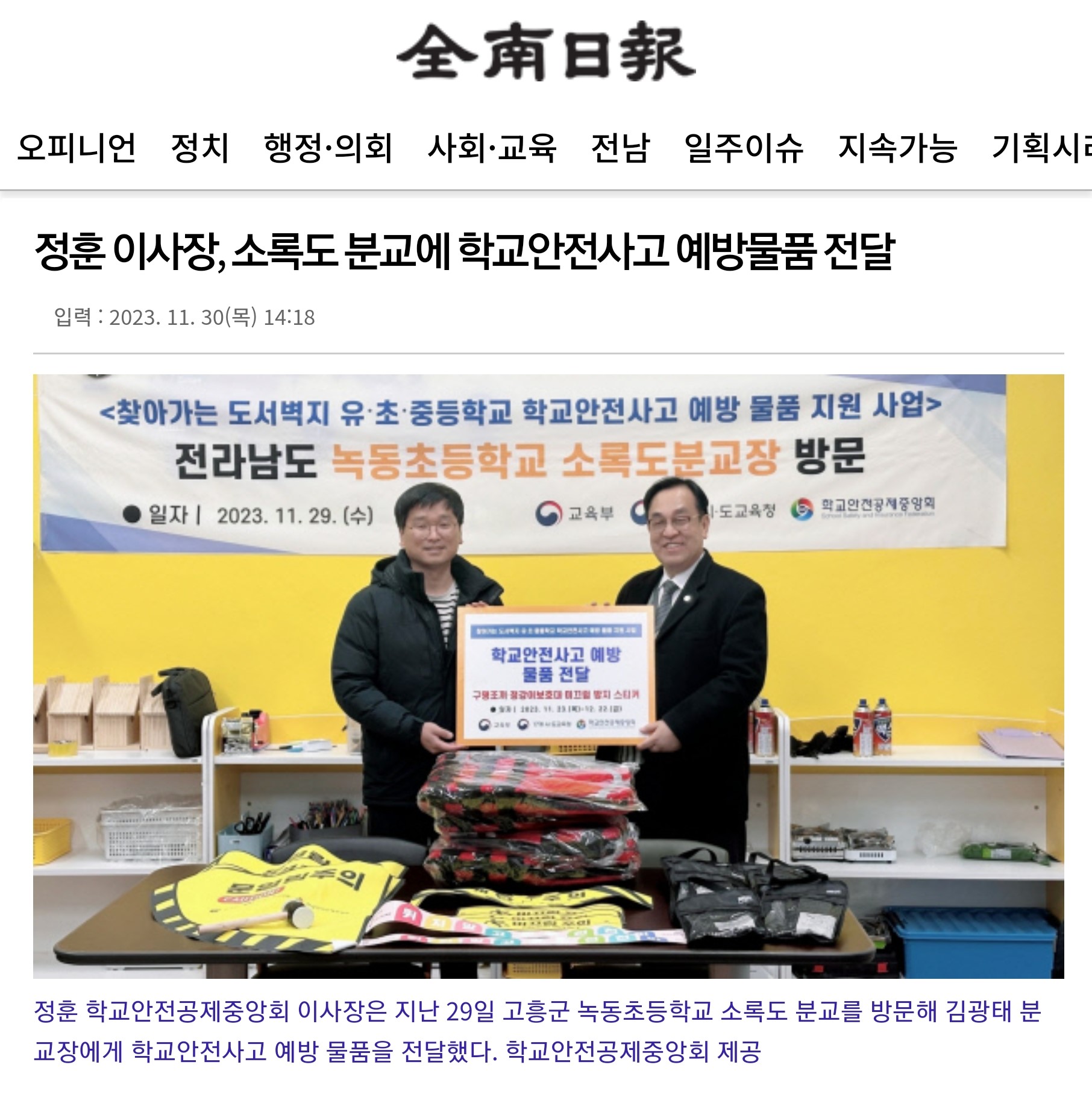 □ [전남일보] (2023.11.30.) 정훈 이사장, 소록도 분교에 학교안전사고 예방물품 전달 http://m.jnilbo.com/72117692582