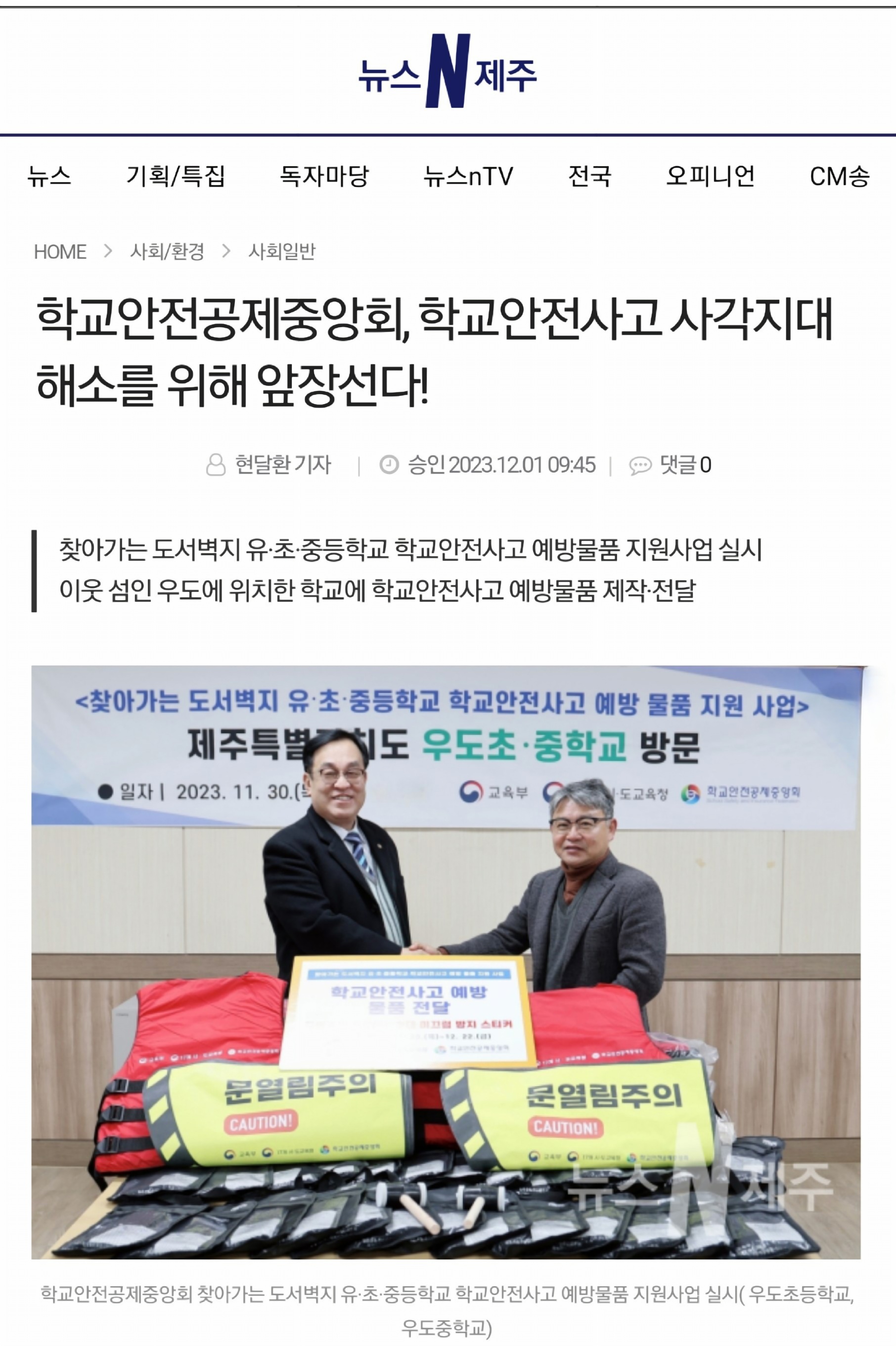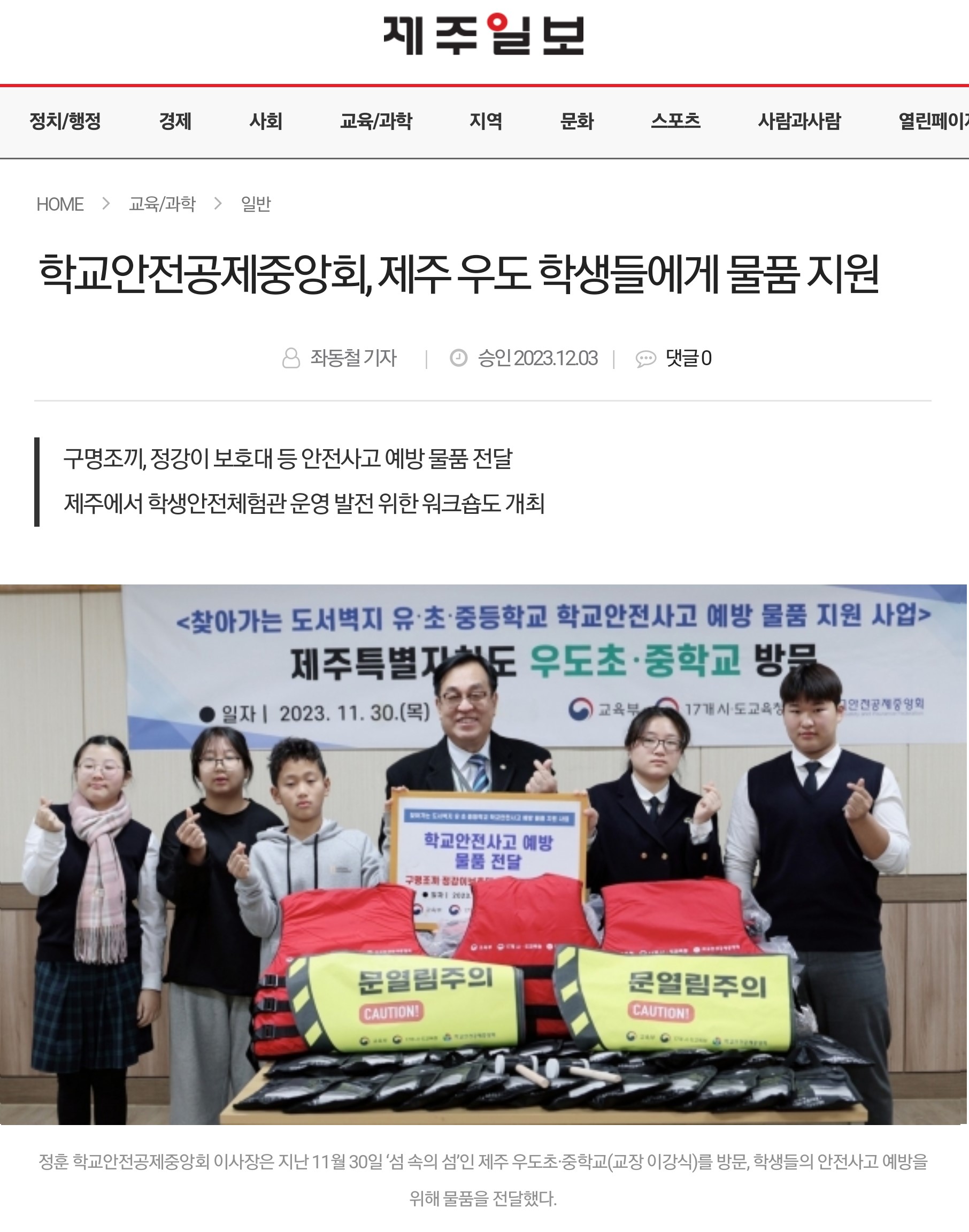 □ [제주일보] (2023.12.3.) 학교안전공제중앙회, 제주 우도 학생들에게 물품 지원 http://www.jejunews.com/news/articleView.html?idxno=2207151