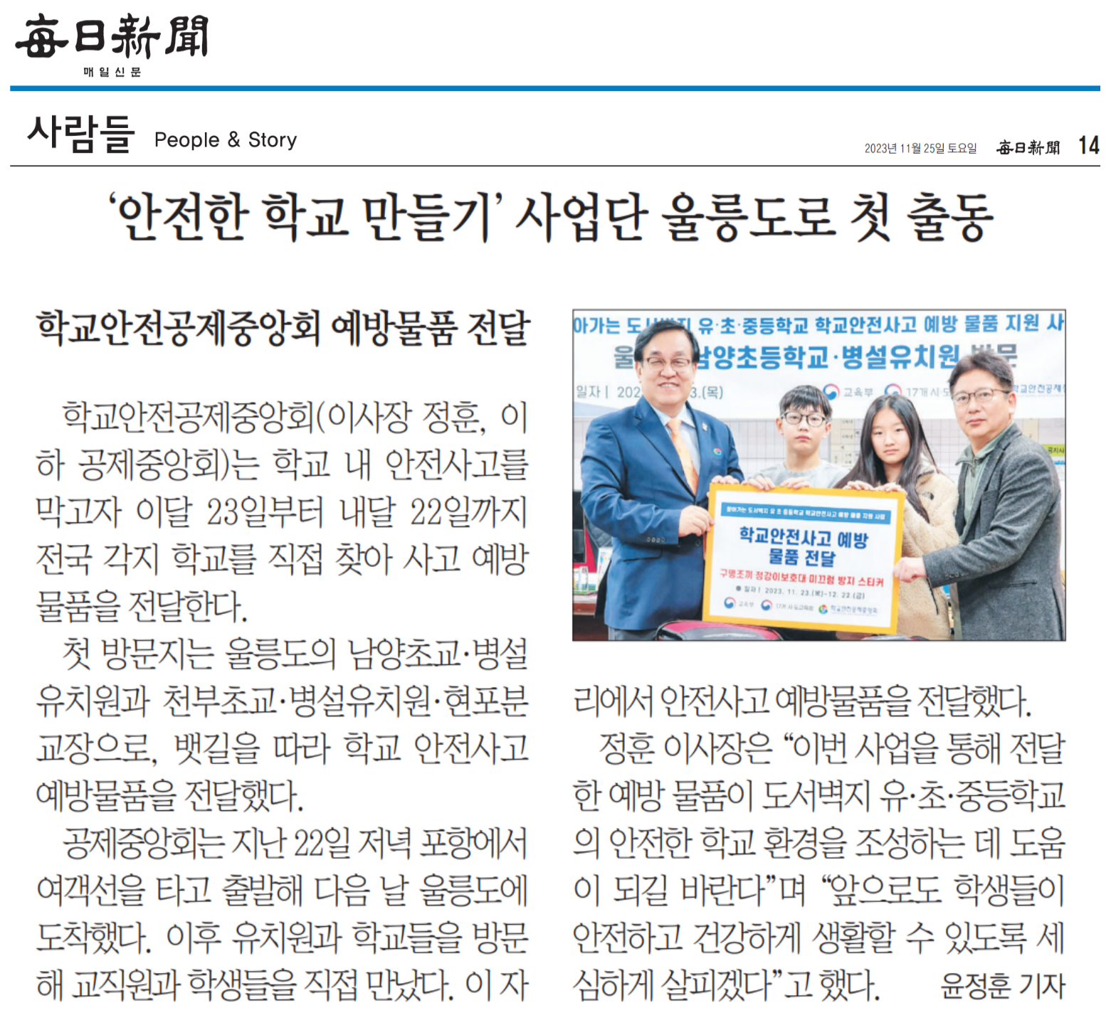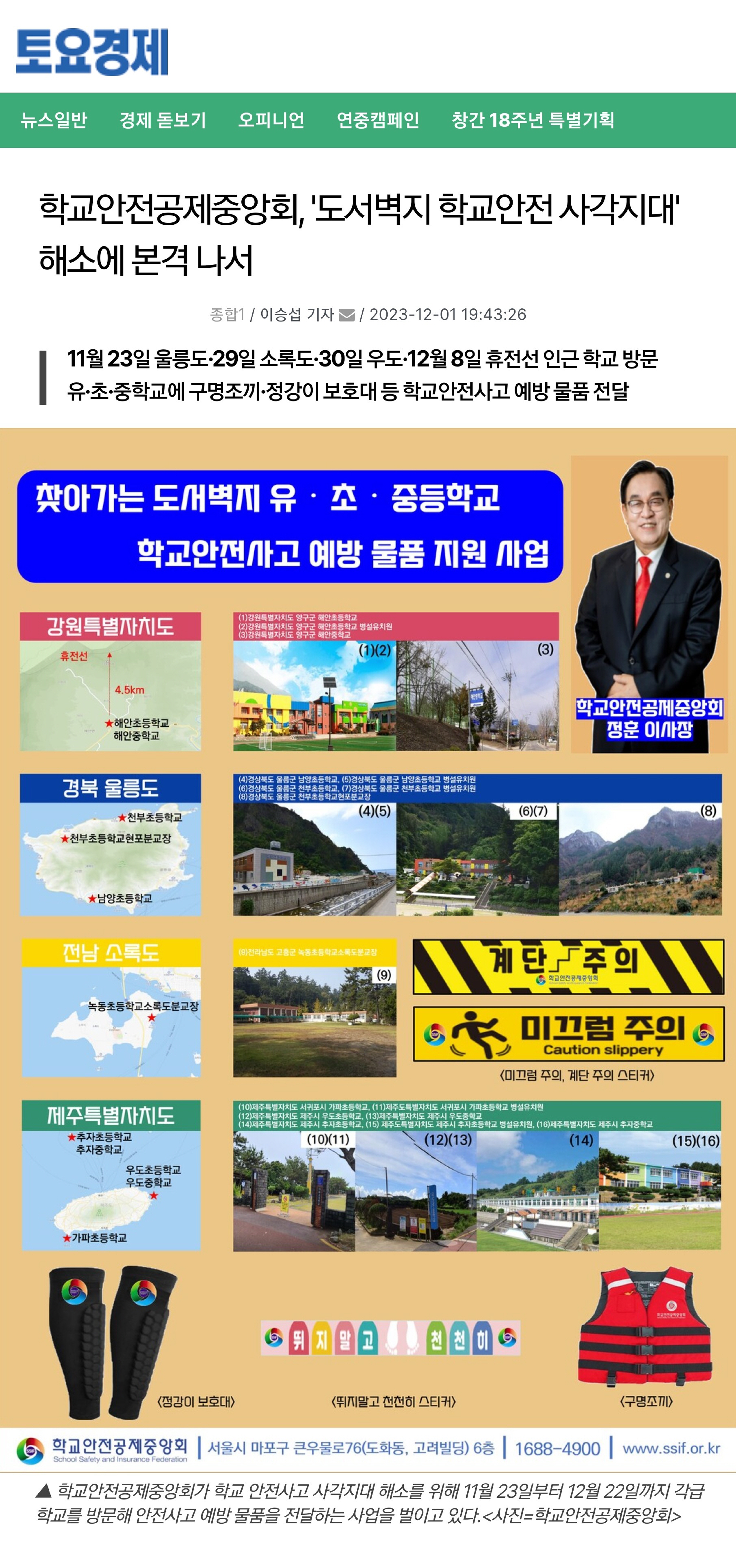 ○ (2023.11.24.) 학교안전공제중앙회, 울릉 초교 안전 사수 : 지면신문 12면