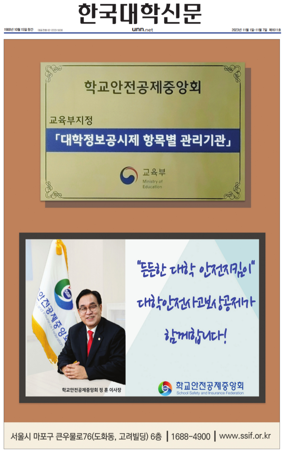 ○ (2023.11.1.) 대학 안전사고보상공제 사업 : 지면신문 1면