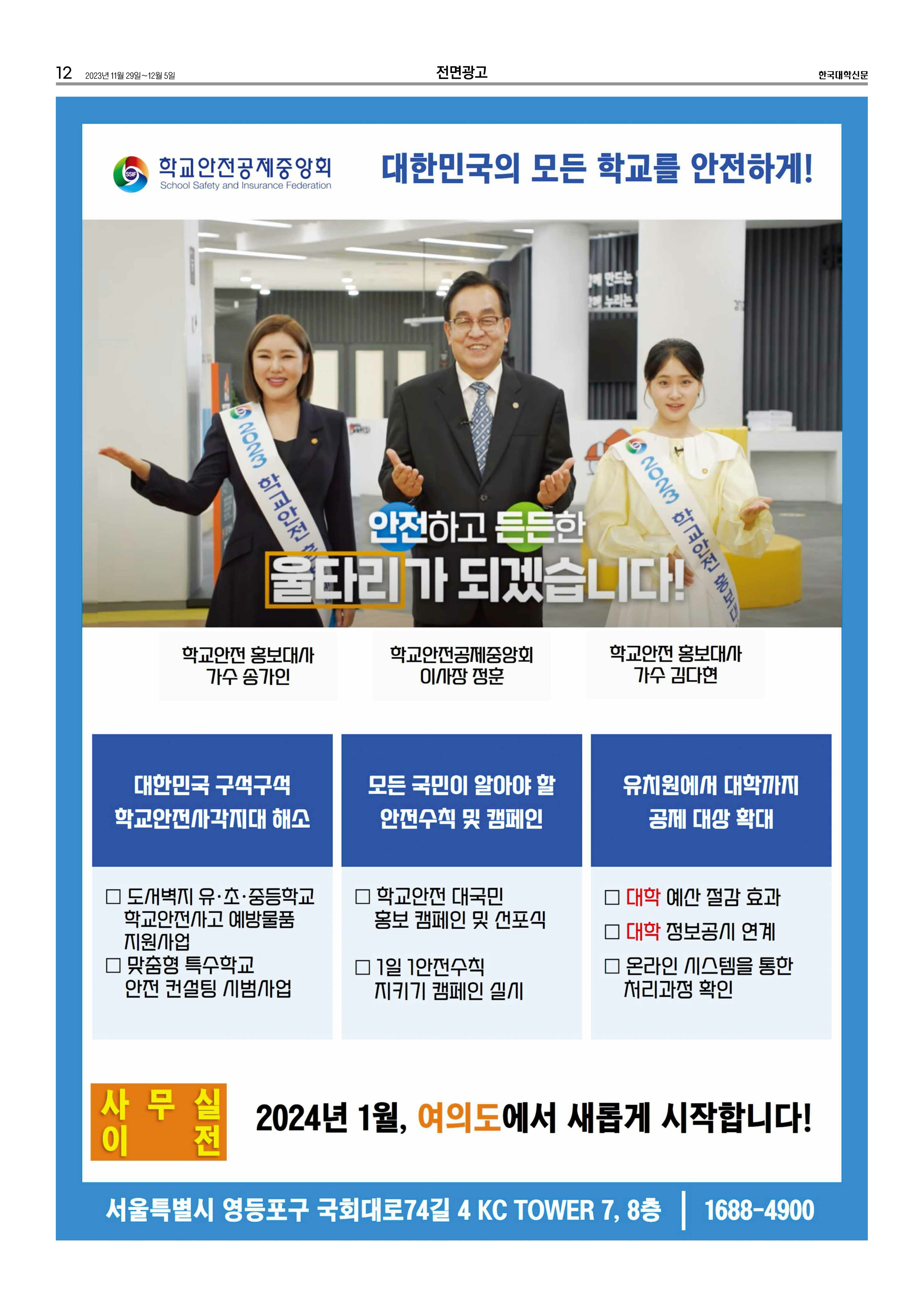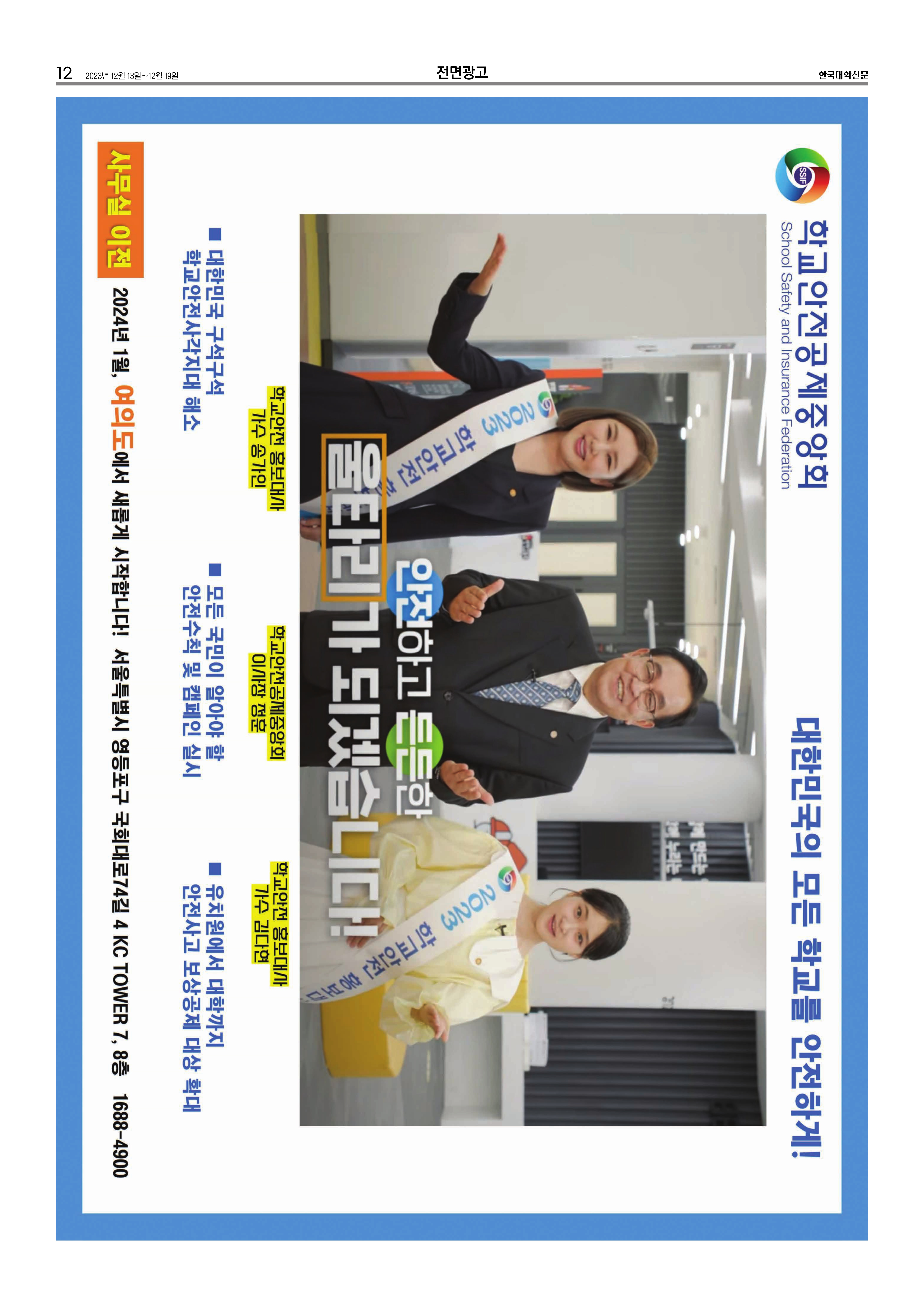 2023년 11월, 12월 학교안전공제중앙회 보도기사 및 광고 내용입니다.