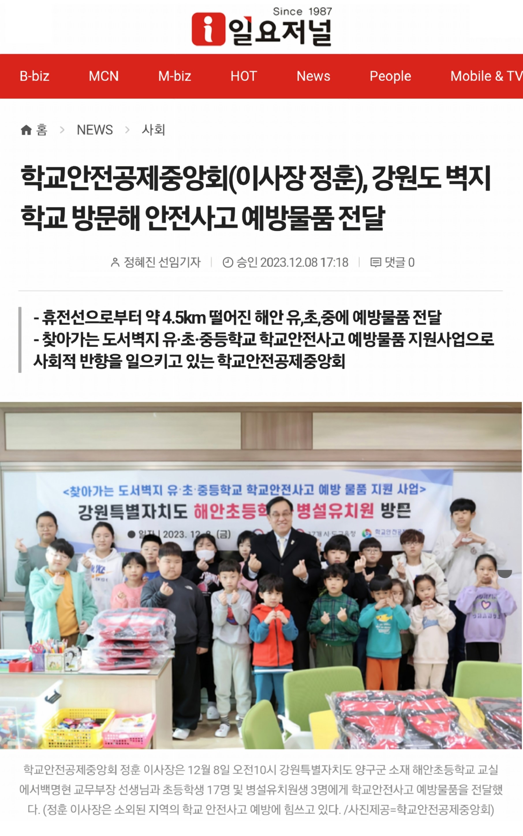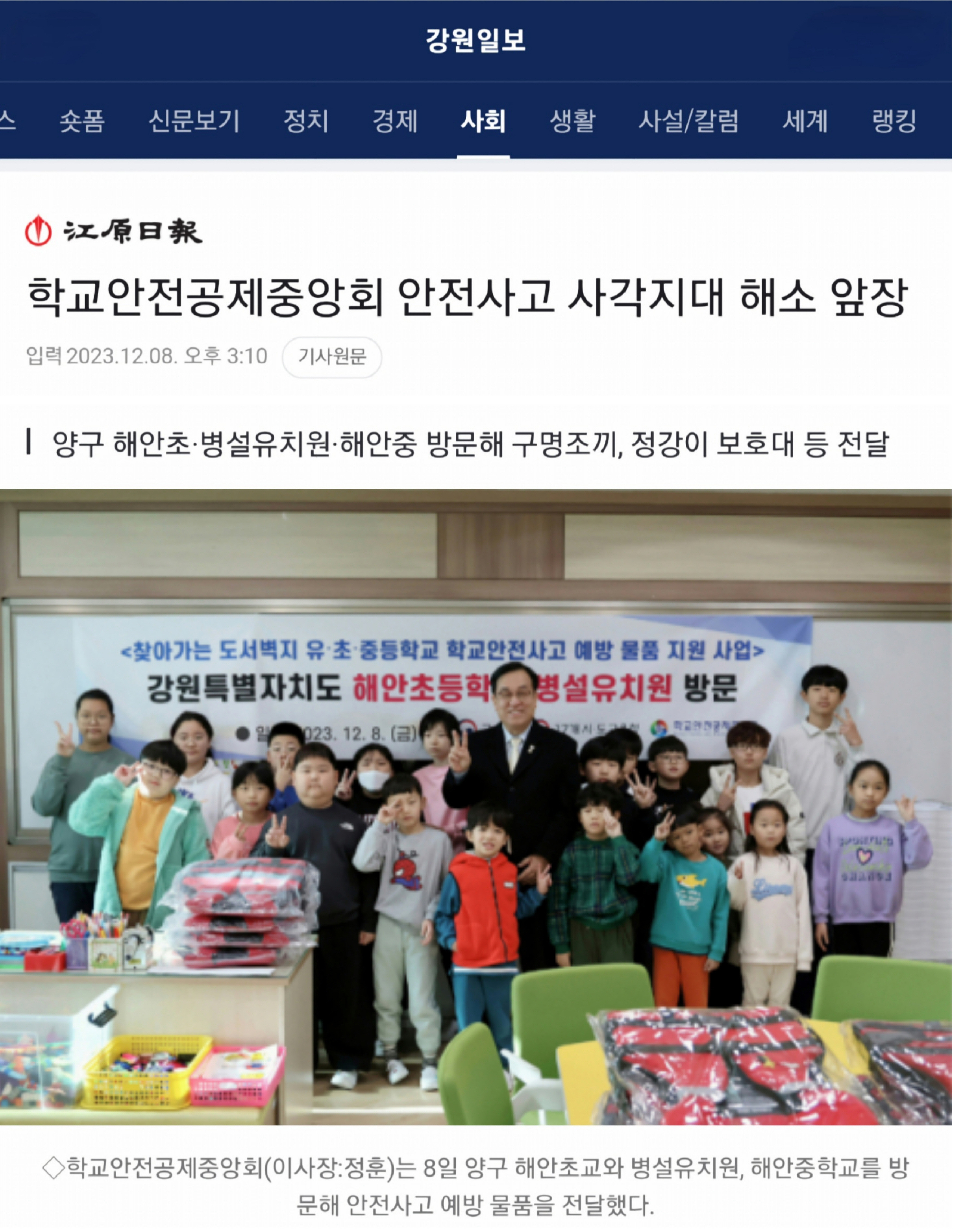 □ [강원도민일보] (2023.12.8.) "어린이들의 안전한 학교 생활을 기원합니다" https://n.news.naver.com/article/654/0000059883
