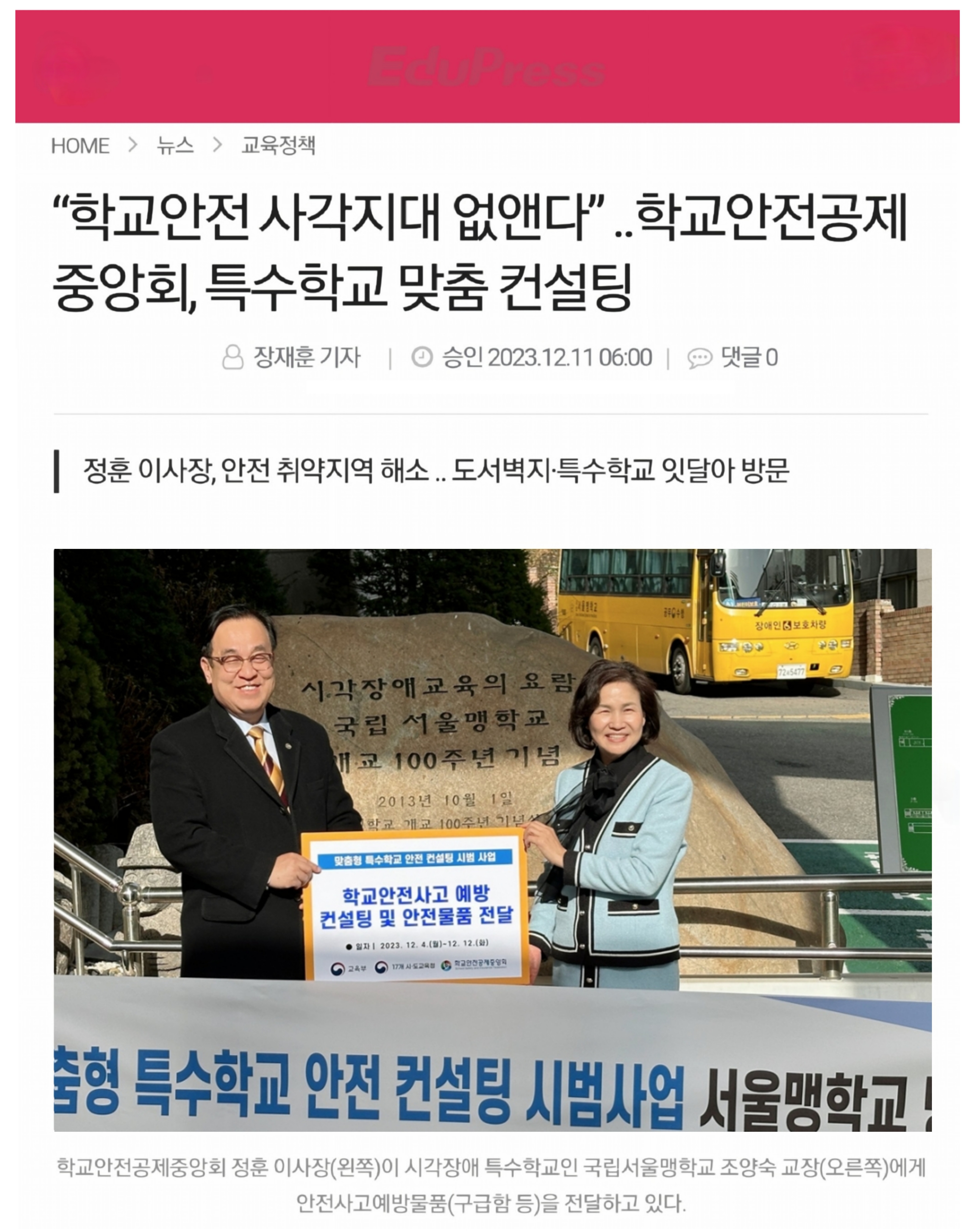 □ [에듀프레스] (2023.12.11.) “학교안전 사각지대 없앤다” ..학교안전공제중앙회, 특수학교 맞춤 컨설팅 http://www.edupress.kr/news/articleView.html?idxno=11160