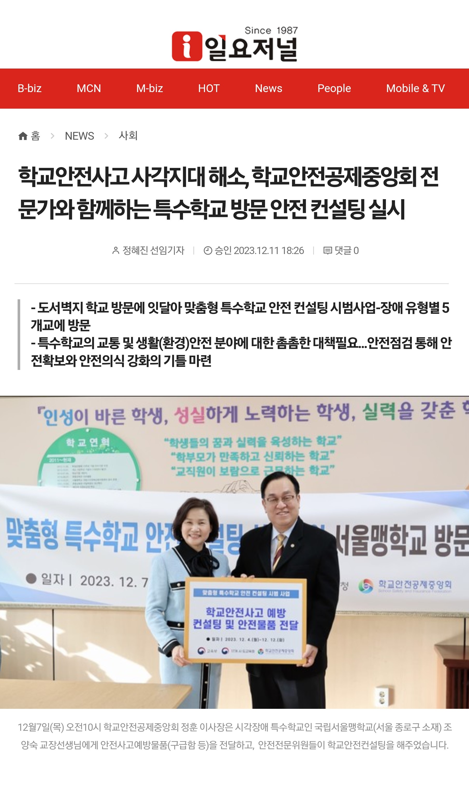 □ [일요저널] (2023.12.12.) 학교안전사고 사각지대 해소, 학교안전공제중앙회 전문가와 함께하는 특수학교 방문 안전 컨설팅 실시 https://www.ilyojournal.com/news/articleView.html?idxno=32149