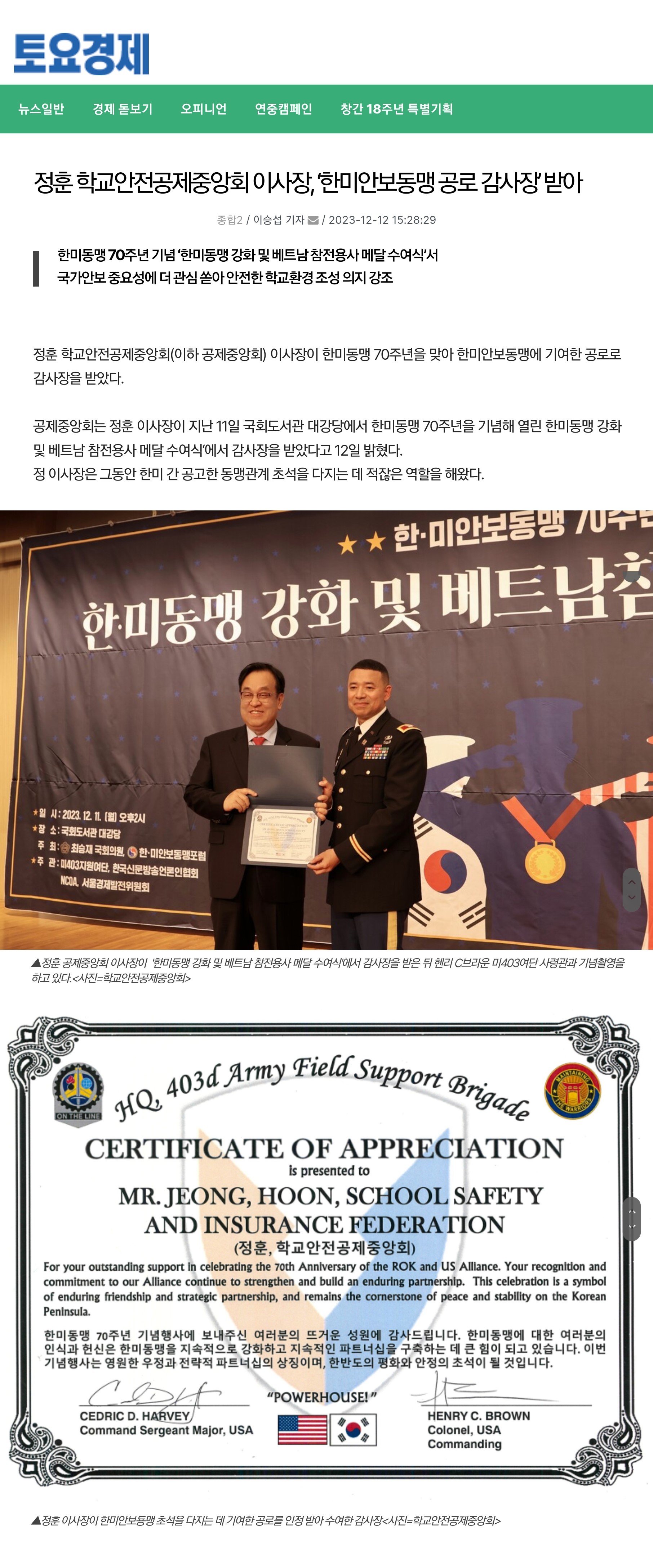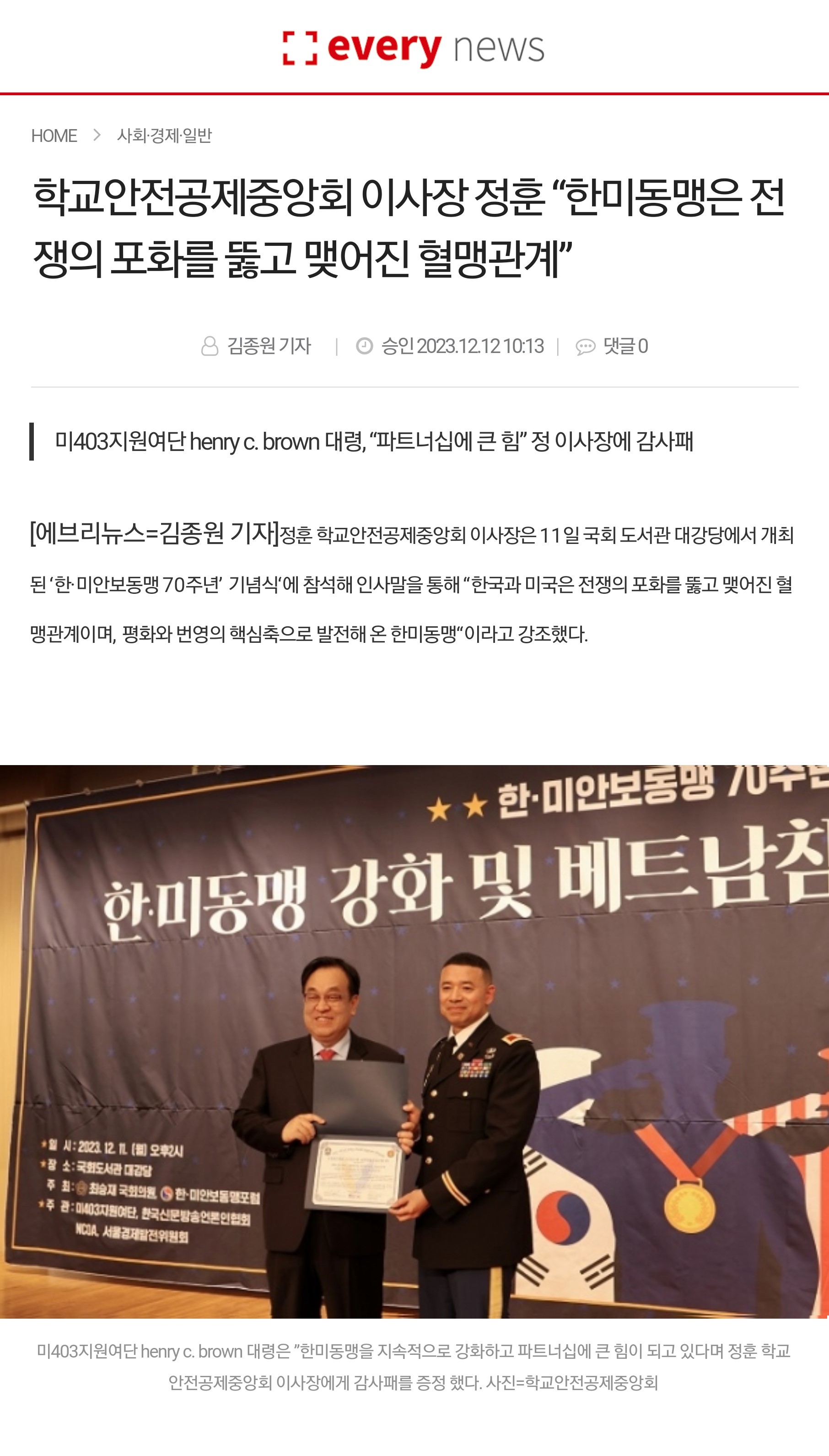 □ [에브리뉴스] (2023.12.12.) 학교안전공제중앙회 이사장 정훈 “한미동맹은 전쟁의 포화를 뚫고 맺어진 혈맹관계” http://www.everynews.co.kr/news/articleView.html?idxno=44386