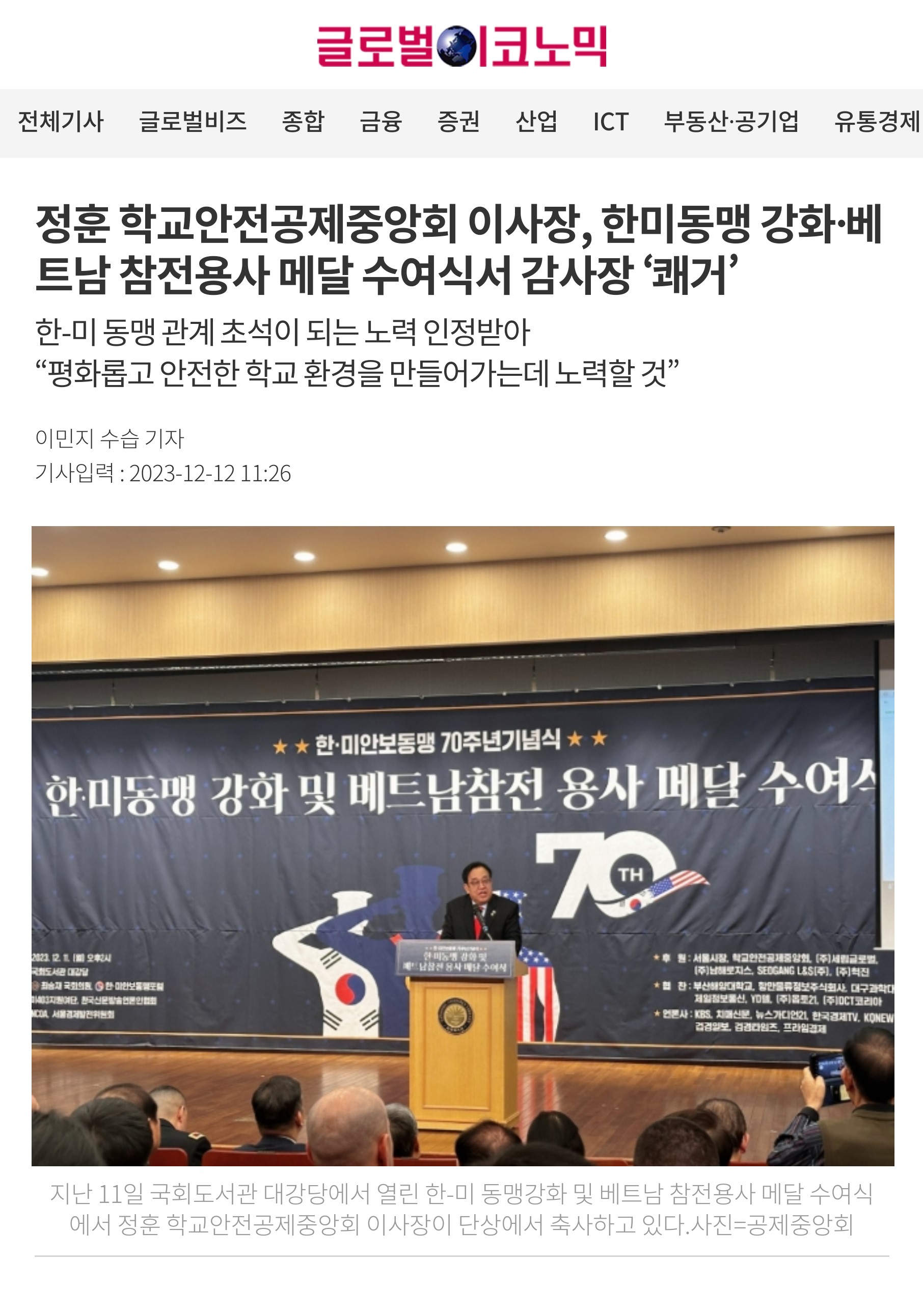 □ [글로벌이코노믹] (2023.12.12.) 정훈 학교안전공제중앙회 이사장, 한미동맹 강화·베트남 참전용사 메달 수여식서 감사장 ‘쾌거’ https://www.g-enews.com/article/General-News/2023/12/202312121112112746a6e8311f64_1