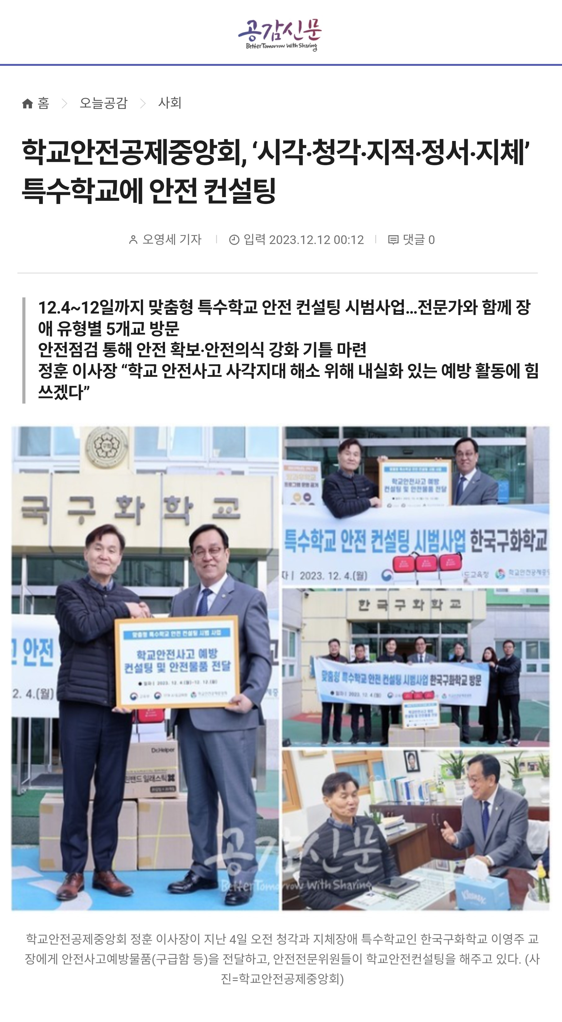 □ [공감신문] (2023.12.12.) 학교안전공제중앙회, ‘시각‧청각‧지적‧정서‧지체’ 특수학교에 안전 컨설팅 https://www.gokorea.kr/news/articleView.html?idxno=747973