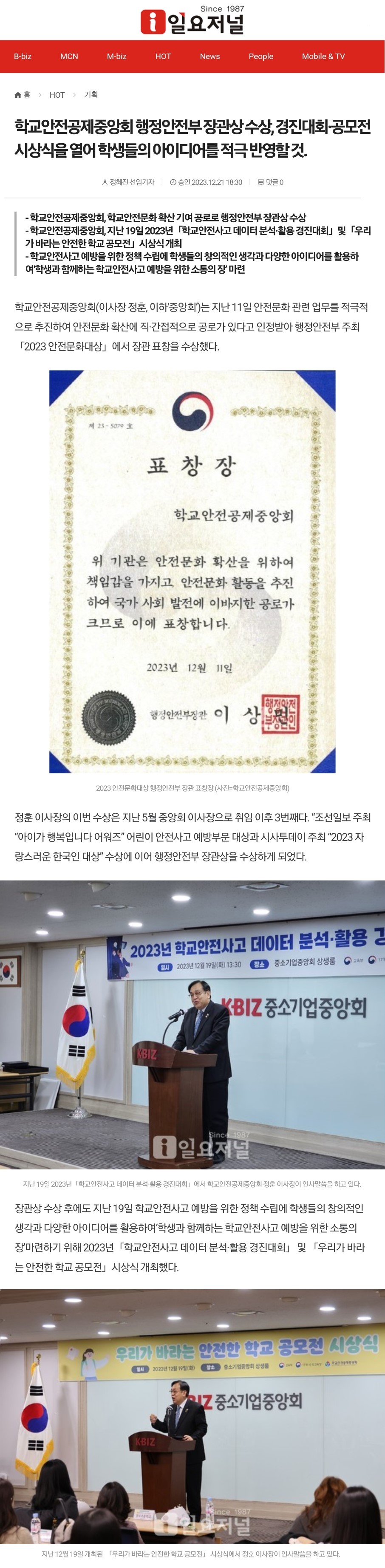 □ [일요저널] (2023.12.21.) 학교안전공제중앙회 행정안전부 장관상 수상, 경진대회·공모전 시상식을 열어 학생들의 아이디어를 적극 반영할 것. https://www.ilyojournal.com/news/articleView.html?idxno=32340