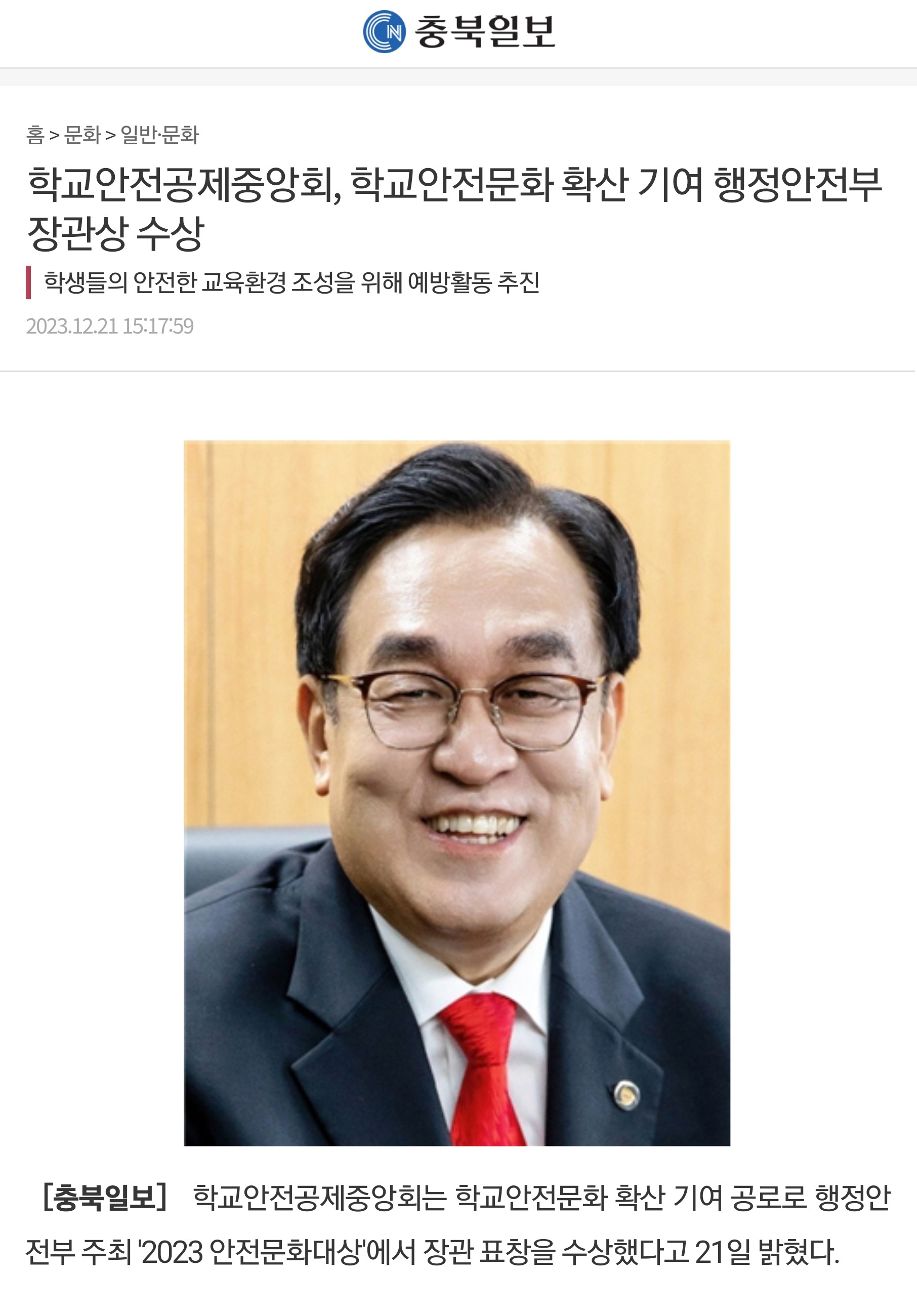 □ [충북일보] (2023.12.21.) 학교안전공제중앙회, 학교안전문화 확산 기여 행정안전부 장관상 수상 https://www.inews365.com/news/article.html?no=794465