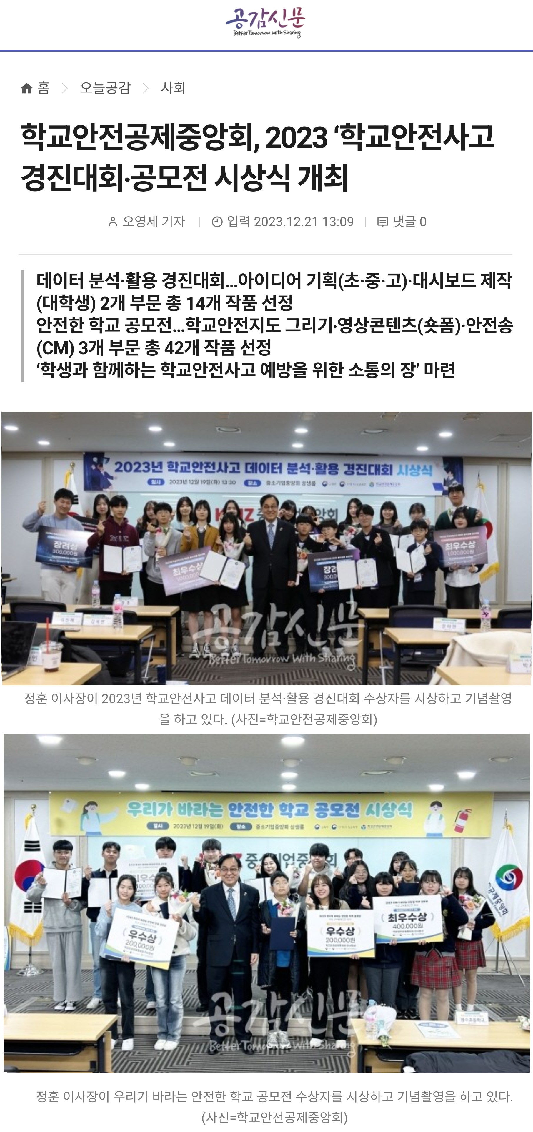 □ [공감신문] (2023.12.21.) 학교안전공제중앙회, 2023 ‘학교안전사고 경진대회‧공모전 시상식 개최 https://www.gokorea.kr/news/articleView.html?idxno=748421