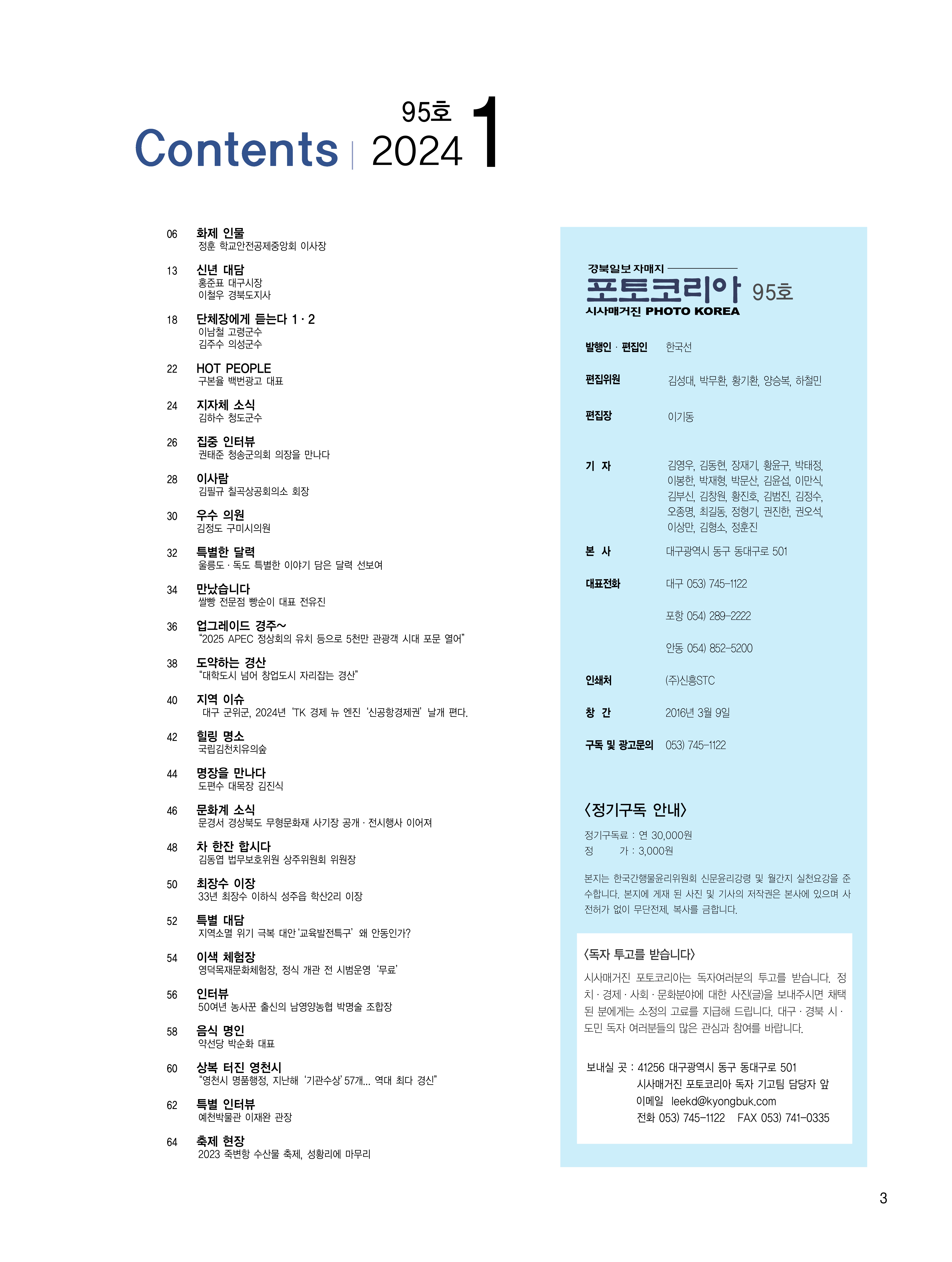 2024년 1월호 시사매거진 PHOTO KOREA 표지 및 화제 인물 학교안전공제중앙회 정훈 이사장 인터뷰 기사입니다(신년 대담 홍준표 대구시장/이철우 경북도지사).