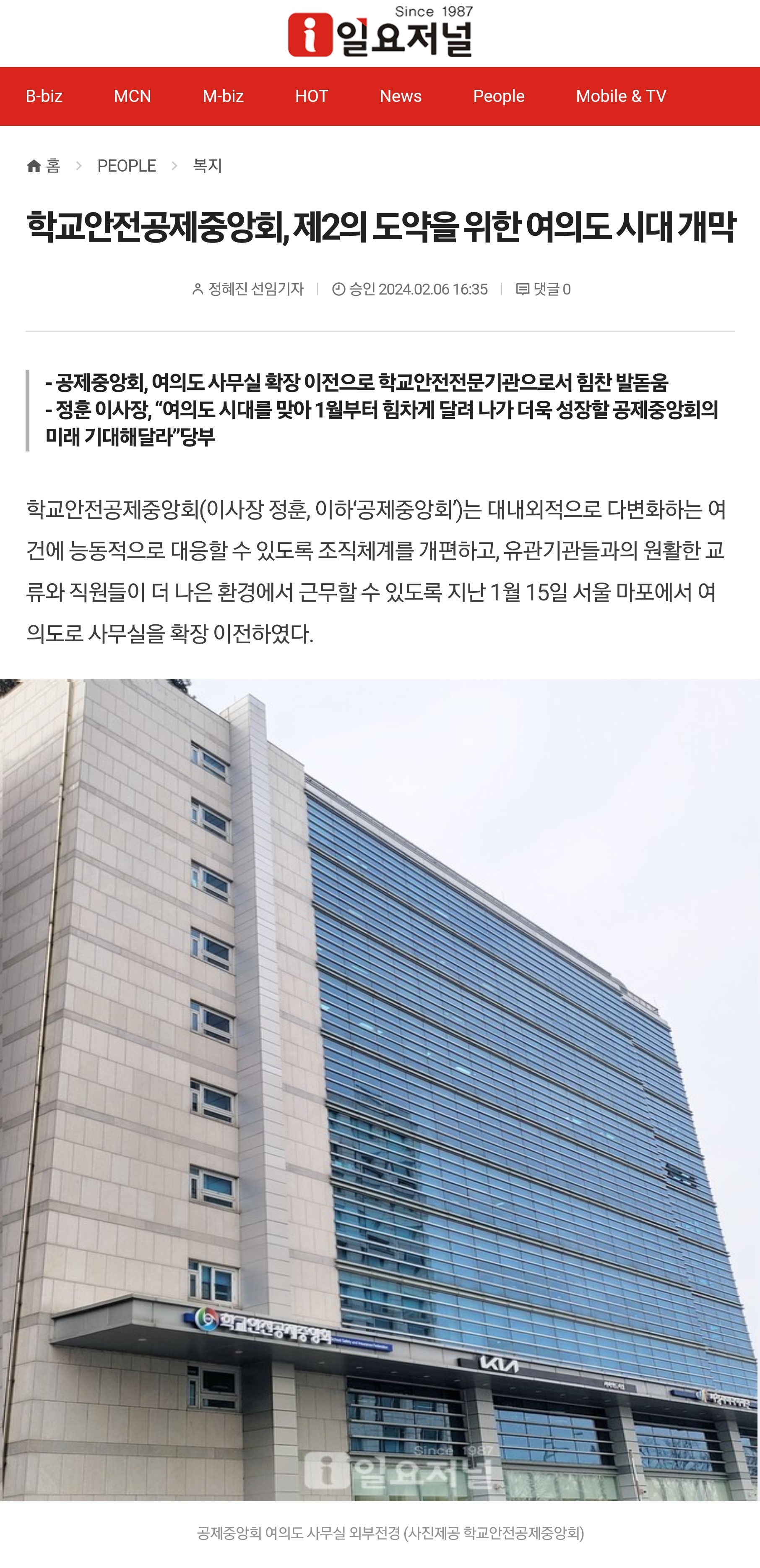 □ [일요저널] (2024.2.6.) 학교안전공제중앙회, 제2의 도약을 위한 여의도 시대 개막 https://www.ilyojournal.com/news/articleView.html?idxno=33537