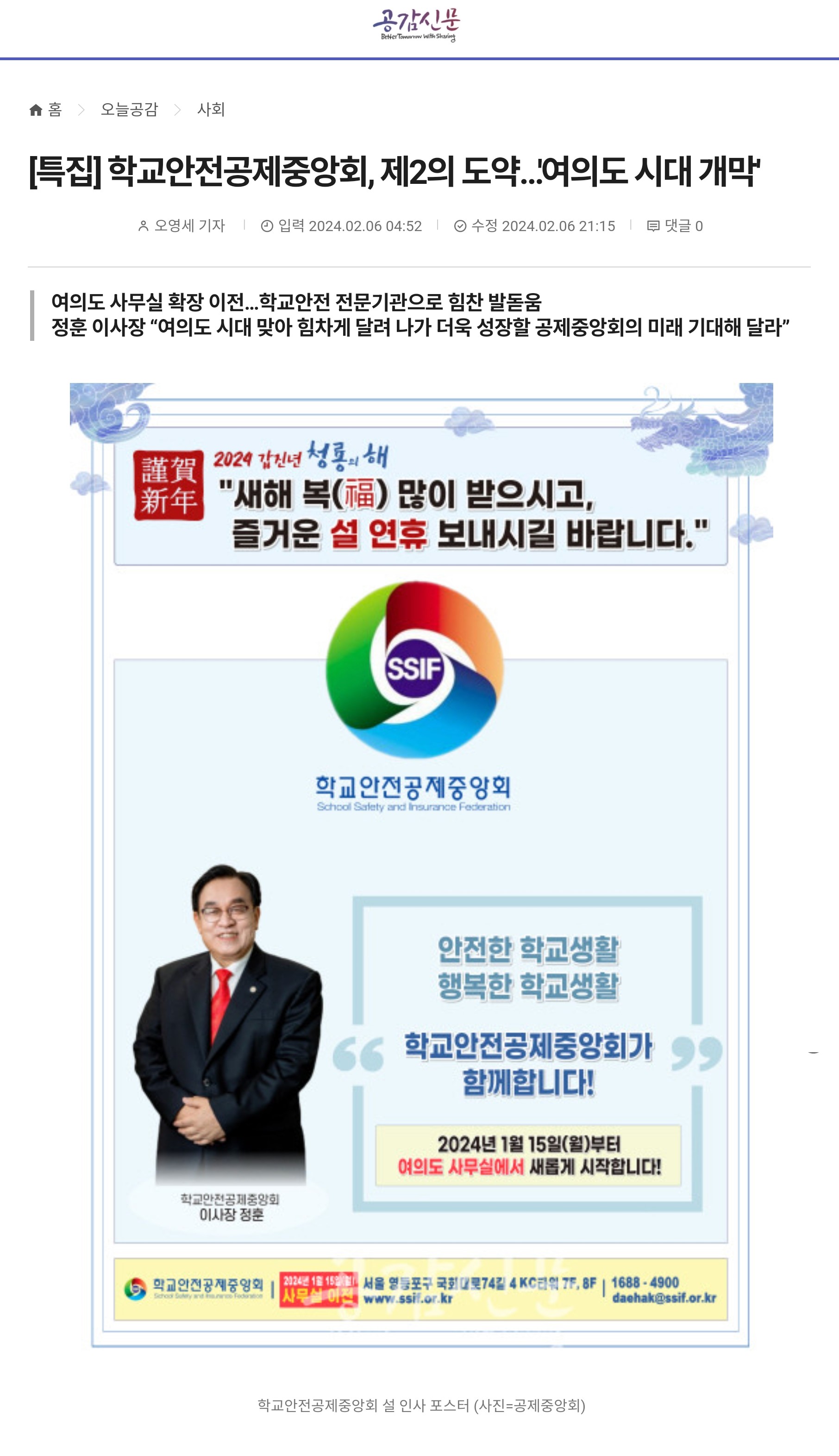 □ [공감신문] (2024.2.6.) [특집] 학교안전공제중앙회, 제2의 도약…'여의도 시대 개막' https://www.gokorea.kr/news/articleView.html?idxno=750321