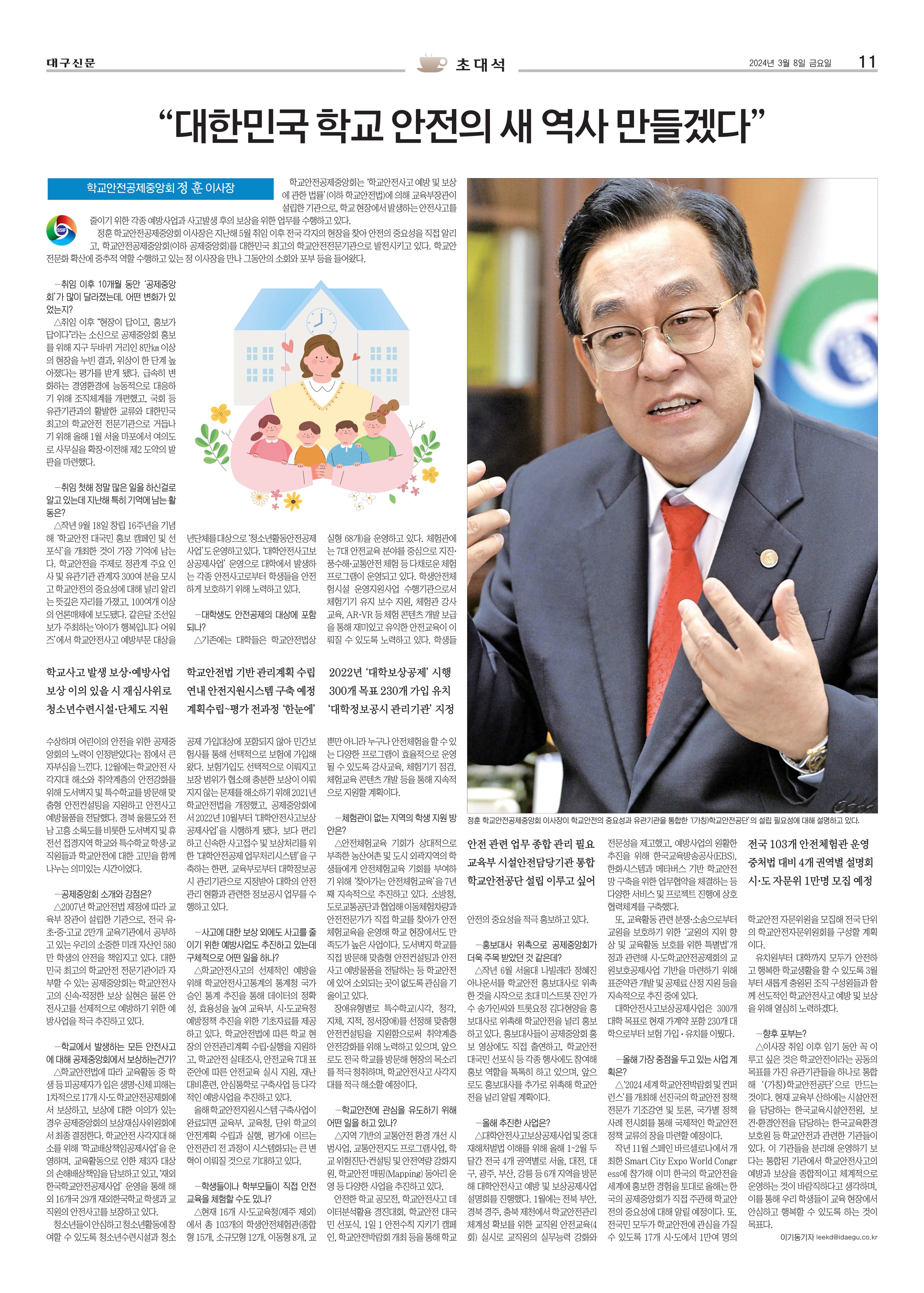 [초대석]이사장 인터뷰, "대한민국 학교 안전의 새 역사 만들겠다” 보도기사(2024.03.08) 및