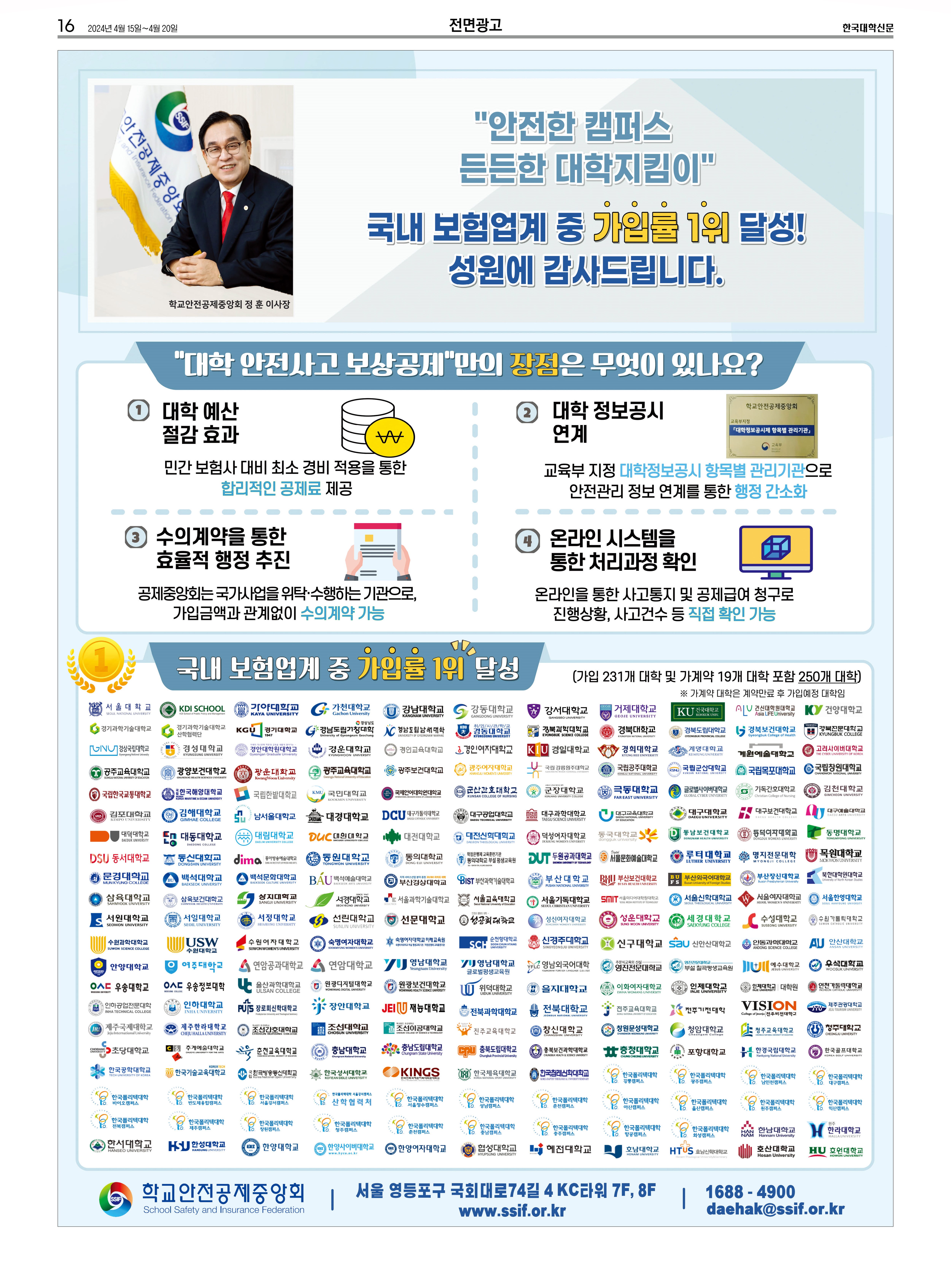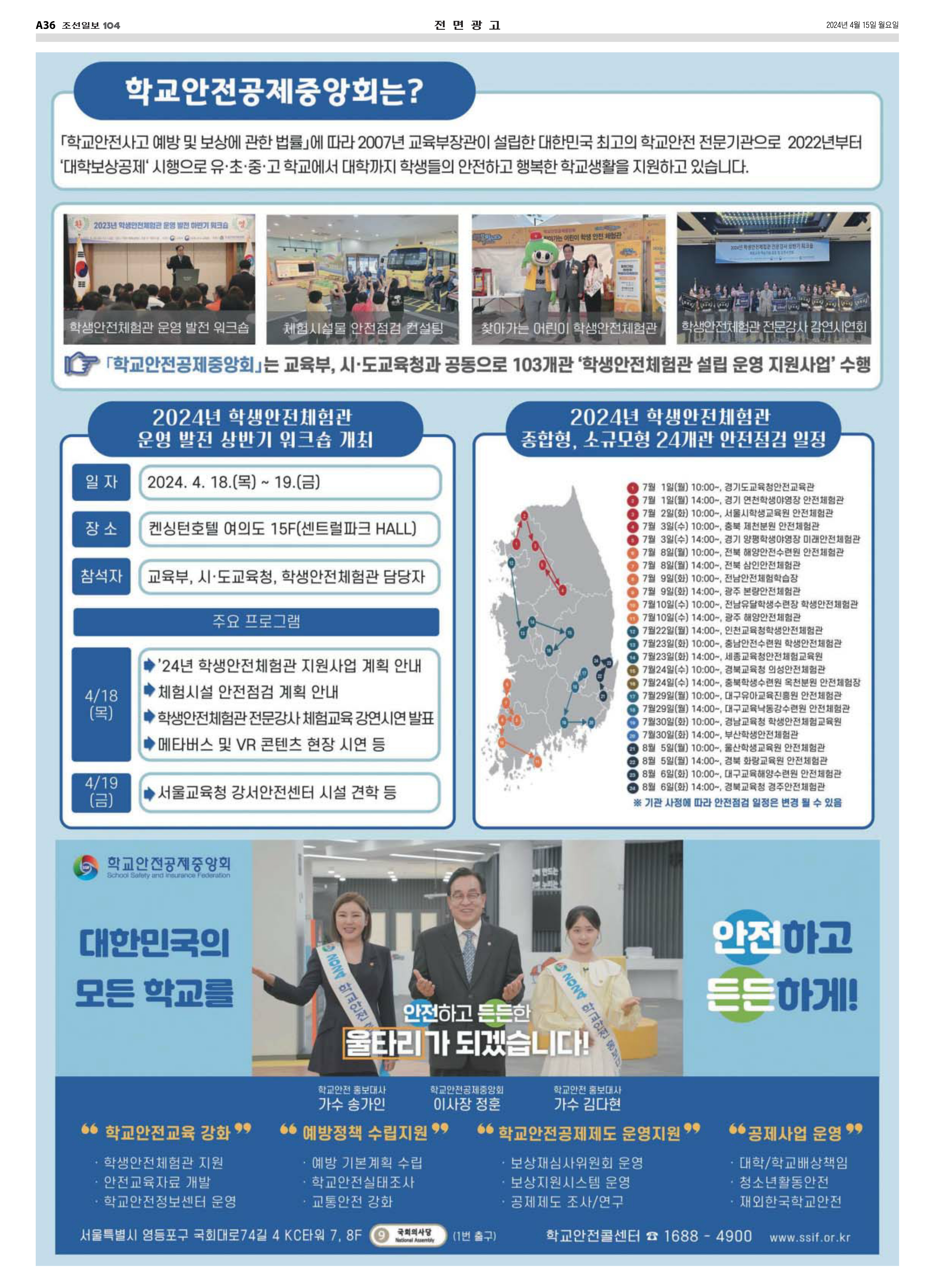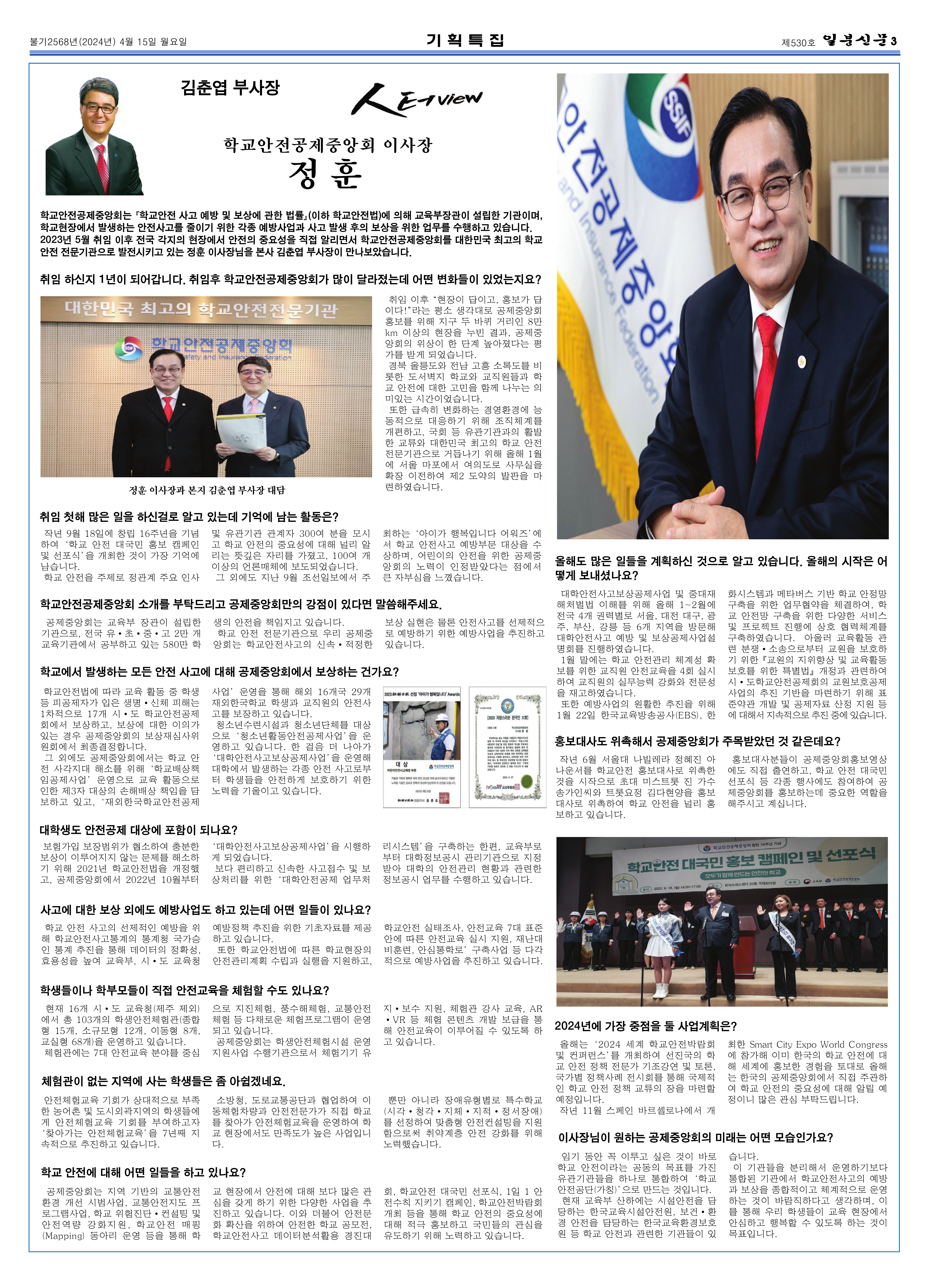 [기획특집]이사장 인터뷰, "대한민국 최고의 학교안전전문기관으로 발전" 보도기사(2024.04.15)와 전면광고 입니다.