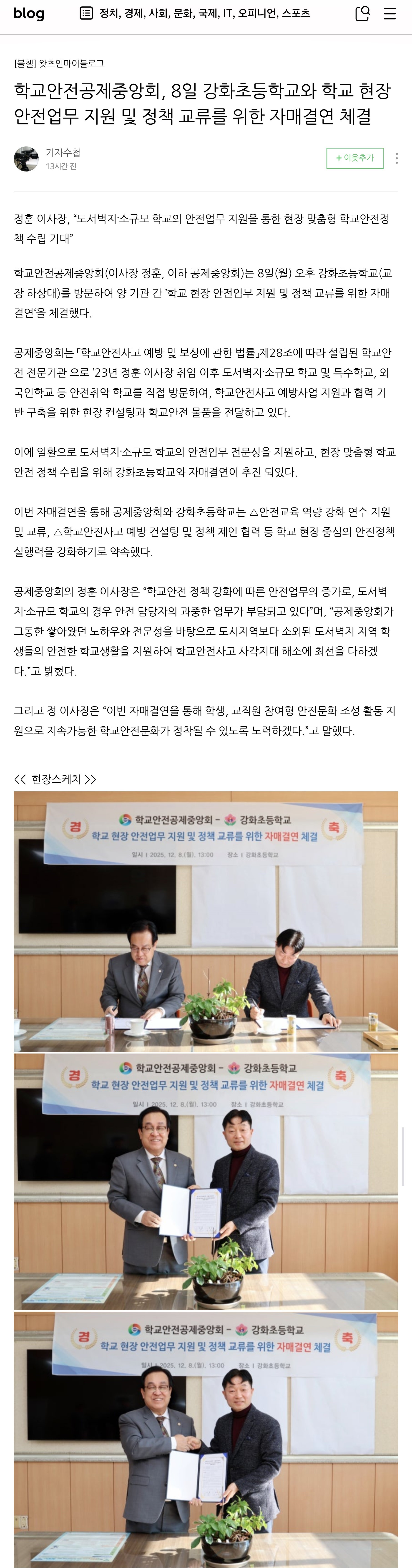 □ [기자수첩] (2025.12.08.) 학교안전공제중앙회, 8일 강화초등학교와 학교 현장 안전업무 지원 및 정책 교류를 위한 자매결연 체결 https://m.blog.naver.com/enhanok70/224102772777