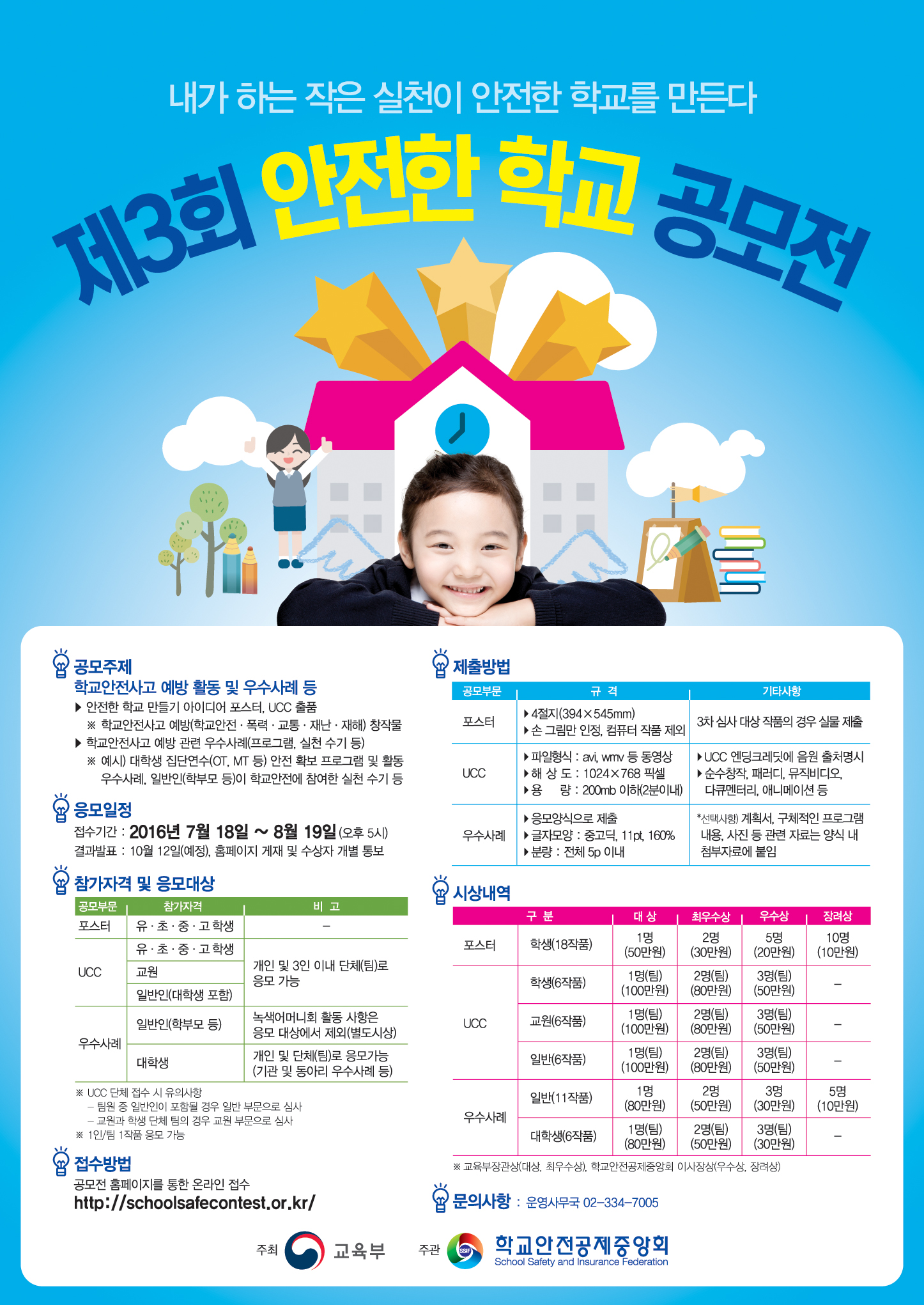 제3회 안전한 학교 공모전 가. 공모주제 : 학교안전사고 예방 활동 및 우수사례 등 나. 주최 : 교육부, 주관 : 학교안전공제중앙회 다. 접수기간 : 16.7.18. ~ 16.8.19.(오후 5시) ※ 자세한 내용은 공모전 홈페이지(http://schoolsafecontest.or.kr) 참고 요망