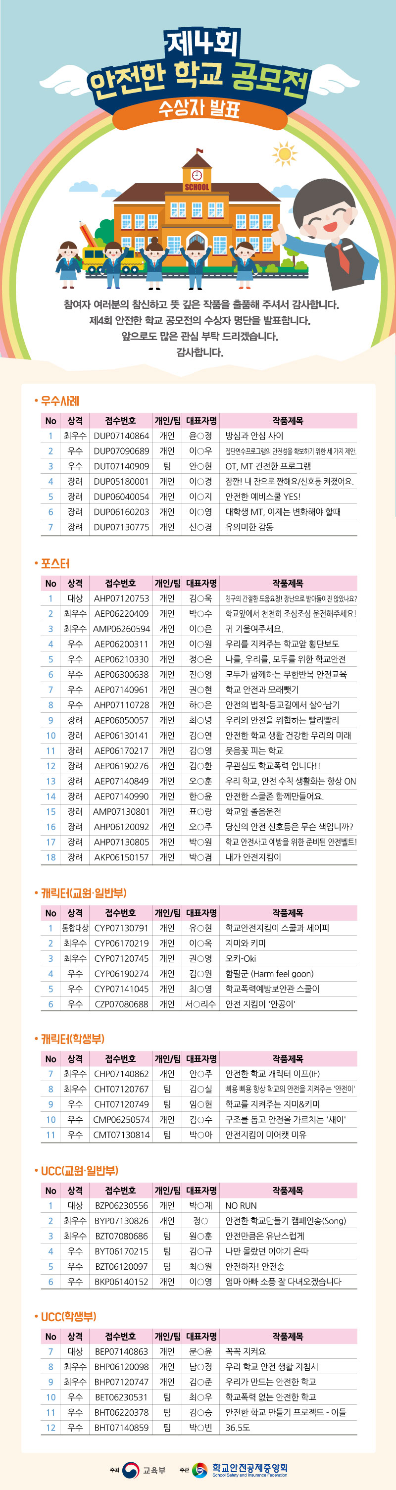 안녕하세요 학교안전공제중앙회입니다. 제4회 안전한학교 공모전 수상자 명단을 발표합니다. 참여자 여러분의 참신하고 뜻깊은 참여에 대해 감사드리며 앞으로도 많은 관심 부탁드립니다. 감사합니다.