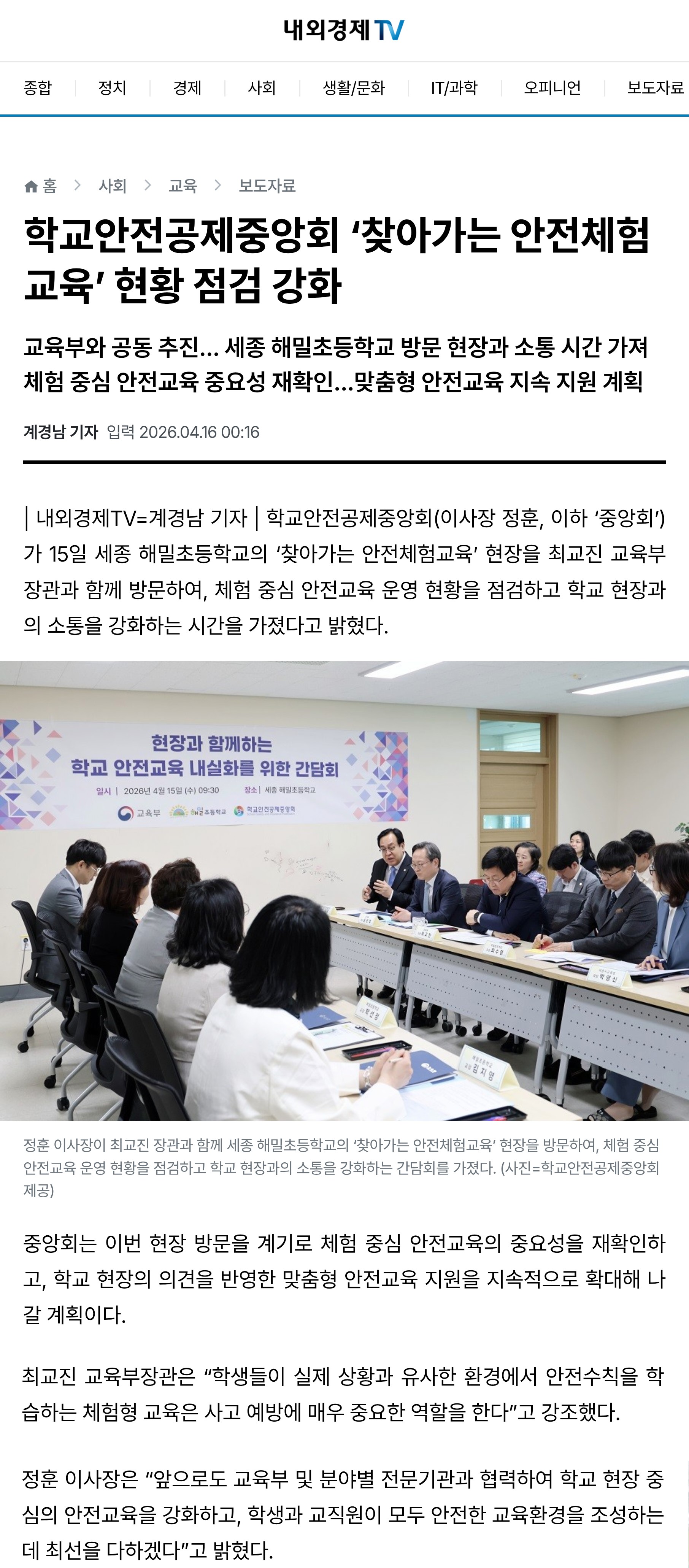 □ [내외경제TV] (2026.04.16.) 학교안전공제중앙회 ‘찾아가는 안전체험교육’ 현황 점검 강화 https://www.nbntv.co.kr/news/articleView.html?idxno=4020823