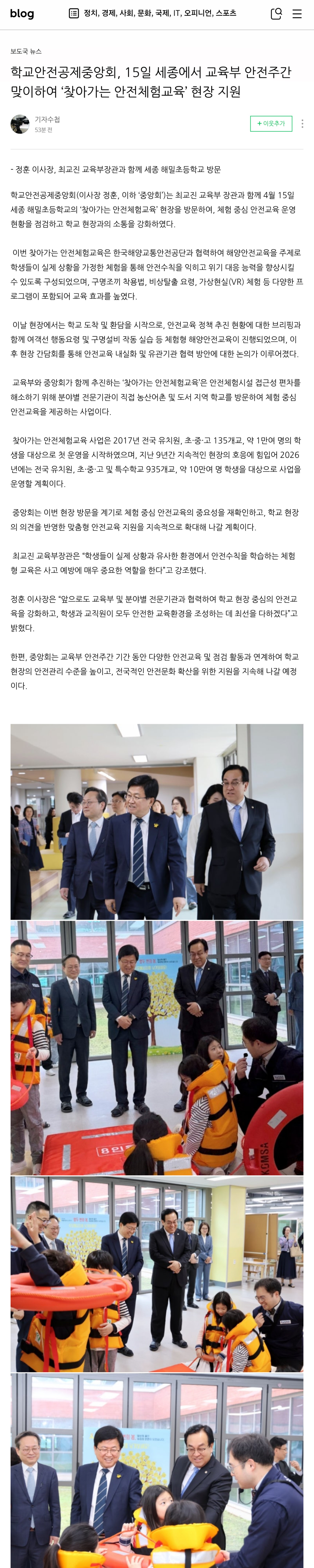 □ [기자수첩] (2026.04.17.) 학교안전공제중앙회, 15일 세종에서 교육부 안전주간 맞이하여 ‘찾아가는 안전체험교육’ 현장 지원 https://m.blog.naver.com/enhanok70/224255575749