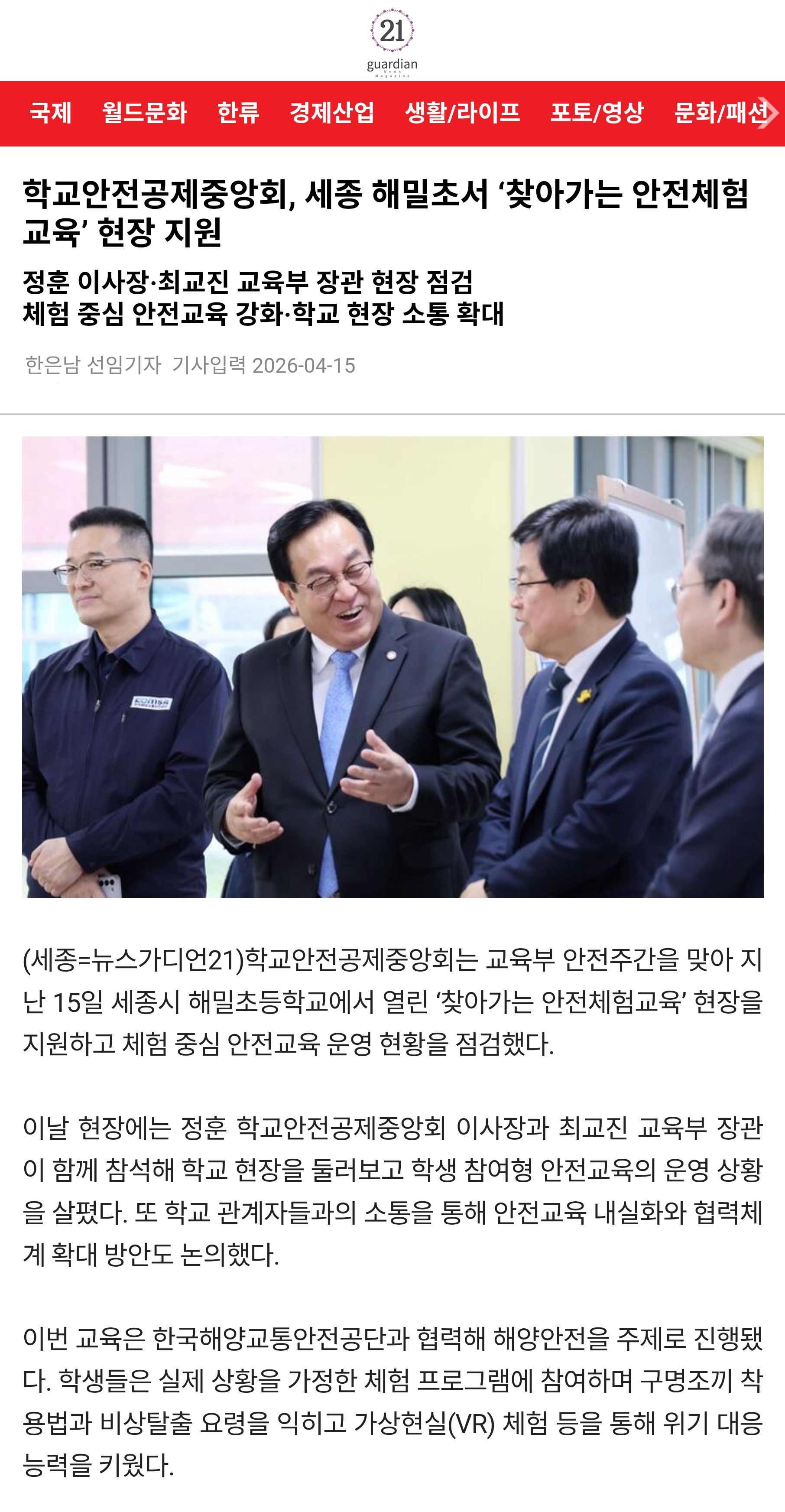 □ [가디언21] (2026.04.15.) 학교안전공제중앙회, 세종 해밀초서 ‘찾아가는 안전체험교육’ 현장 지원 https://www.guardian21.co.kr/81230