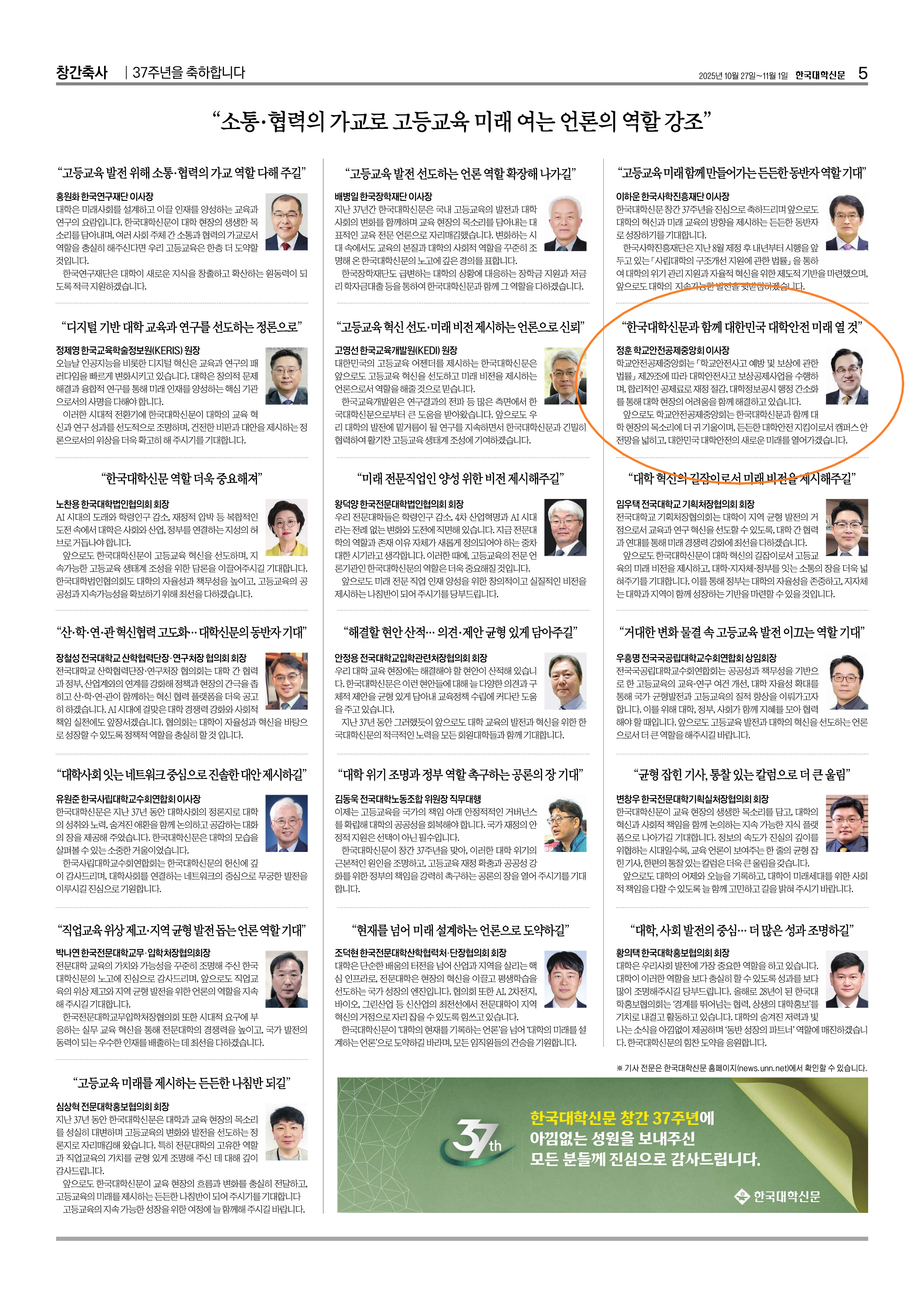 ○ (2025.10.25.) [창간37주년 축사] 정훈 학교안전공제중앙회 이사장 “한국대학신문과 함께 대한민국 대학안전의 미래를 열 것” https://news.unn.net/news/articleView.html?idxno=585239