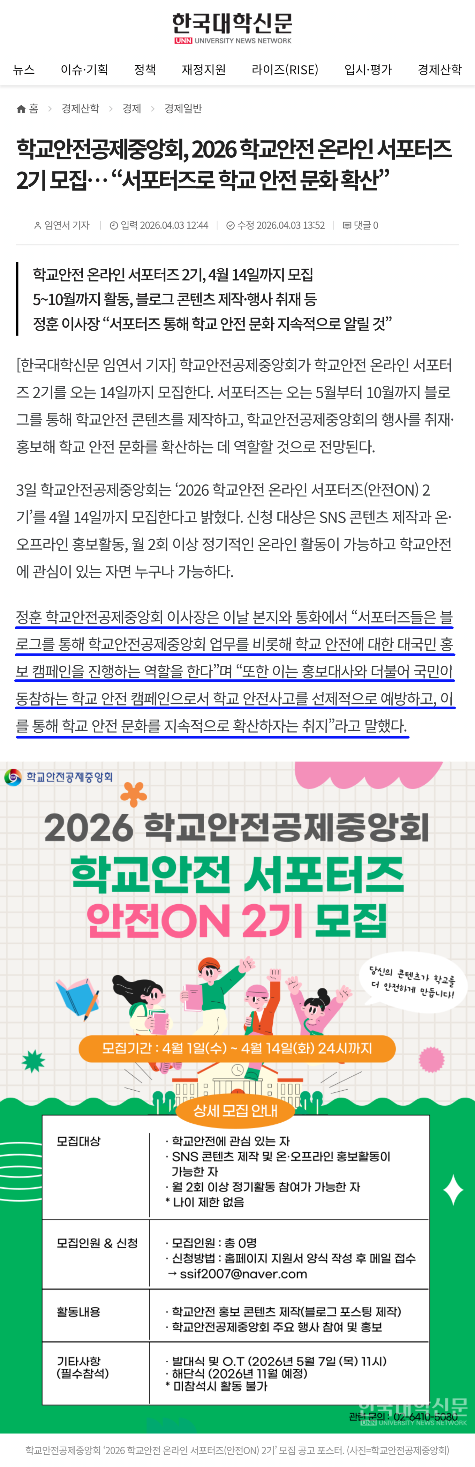 ○ (2026.04.03.) 학교안전공제중앙회, 2026 학교안전 온라인 서포터즈 2기 모집… “서포터즈로 학교 안전 문화 확산” https://news.unn.net/news/articleView.html?idxno=591295