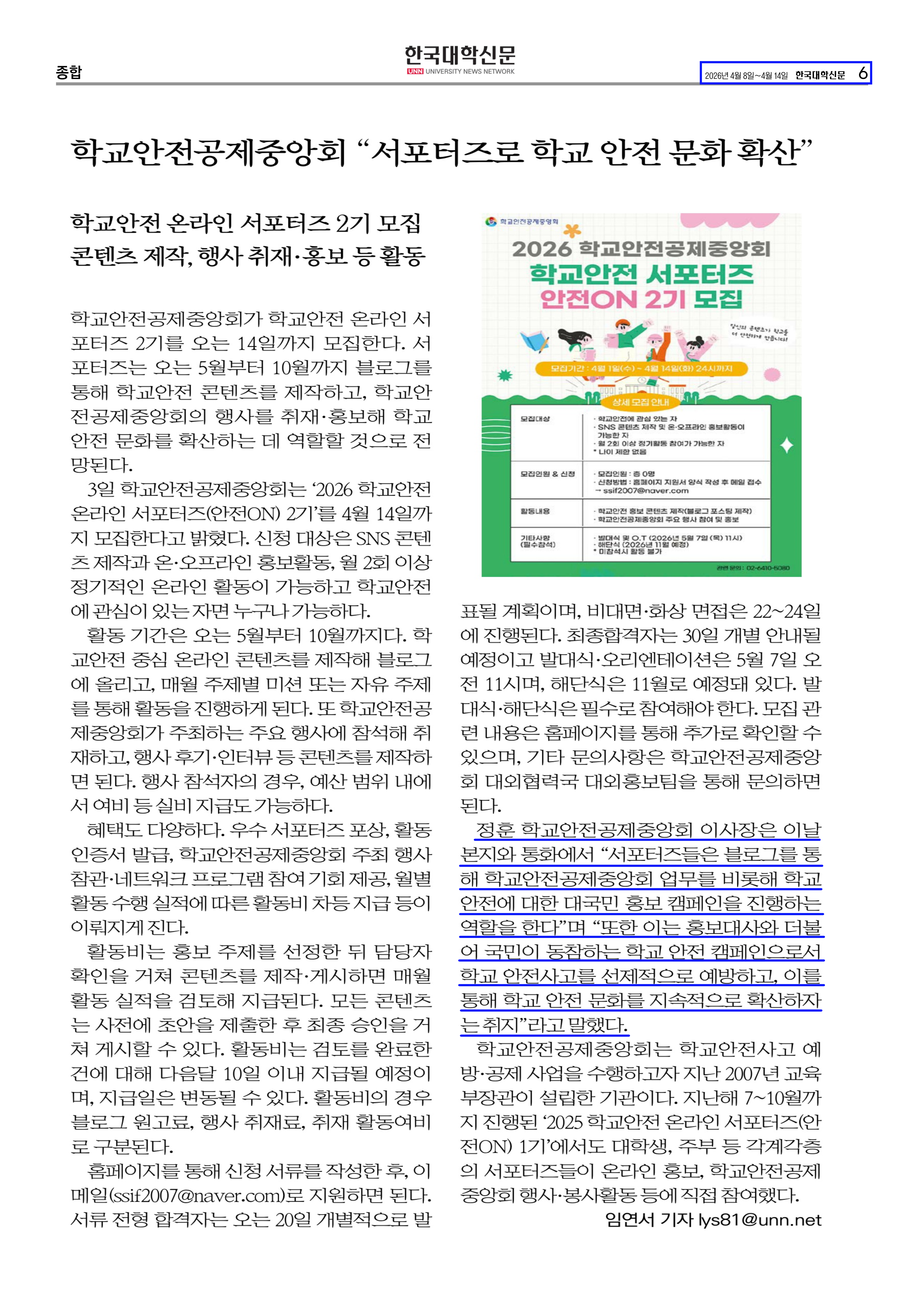 ○ (2026.04.08.) 학교안전공제중앙회 “서포터즈로 학교 안전 문화 확산”: 지면 6면