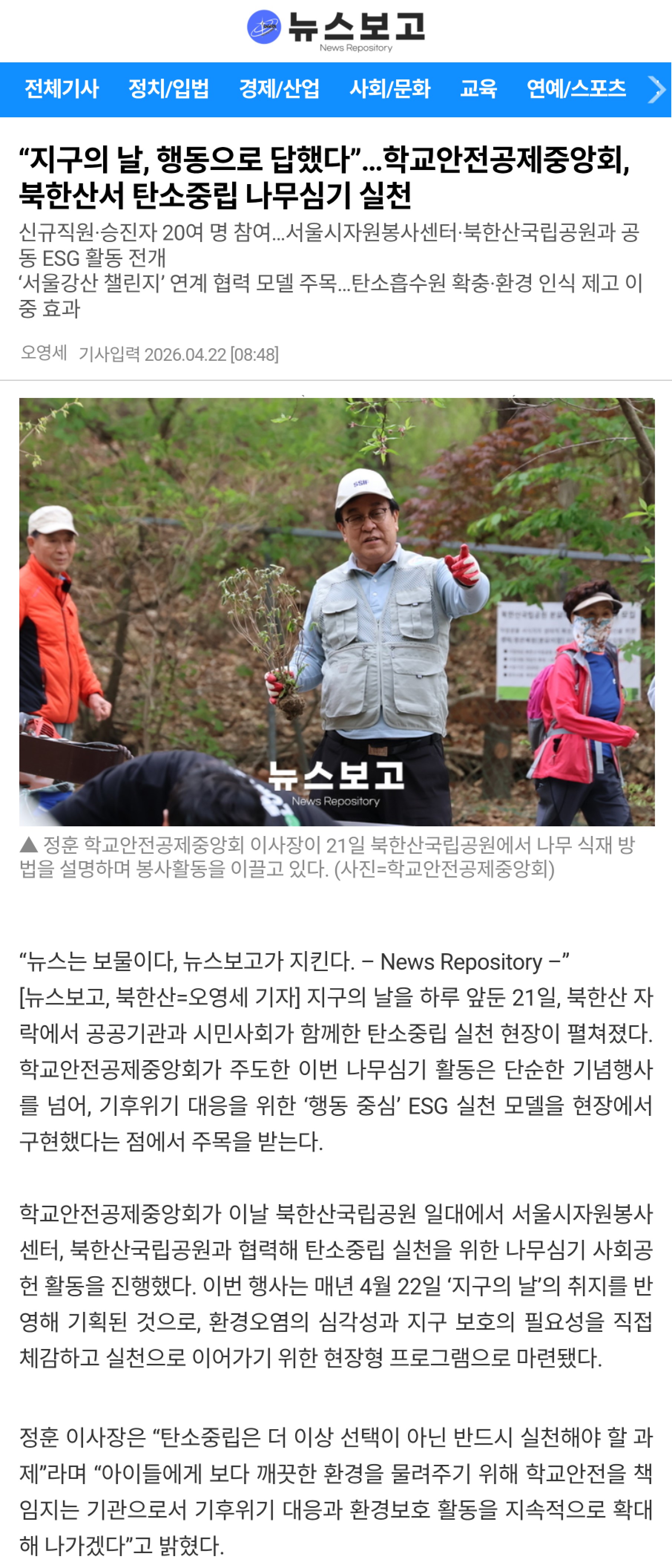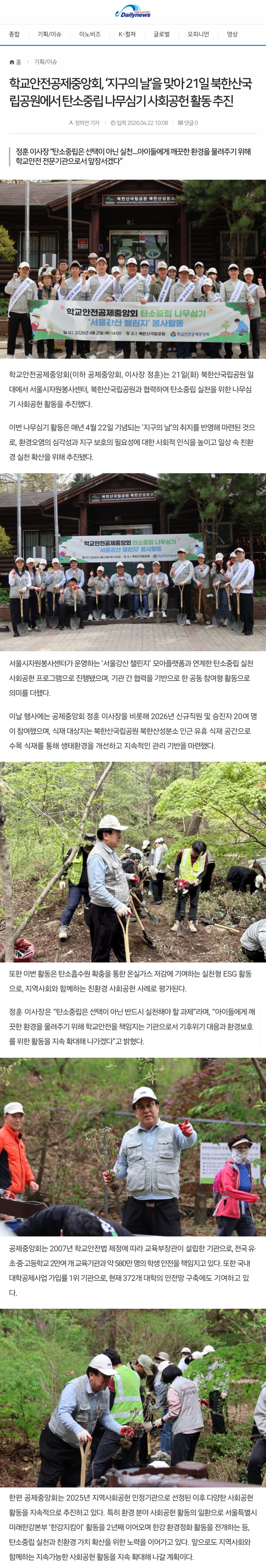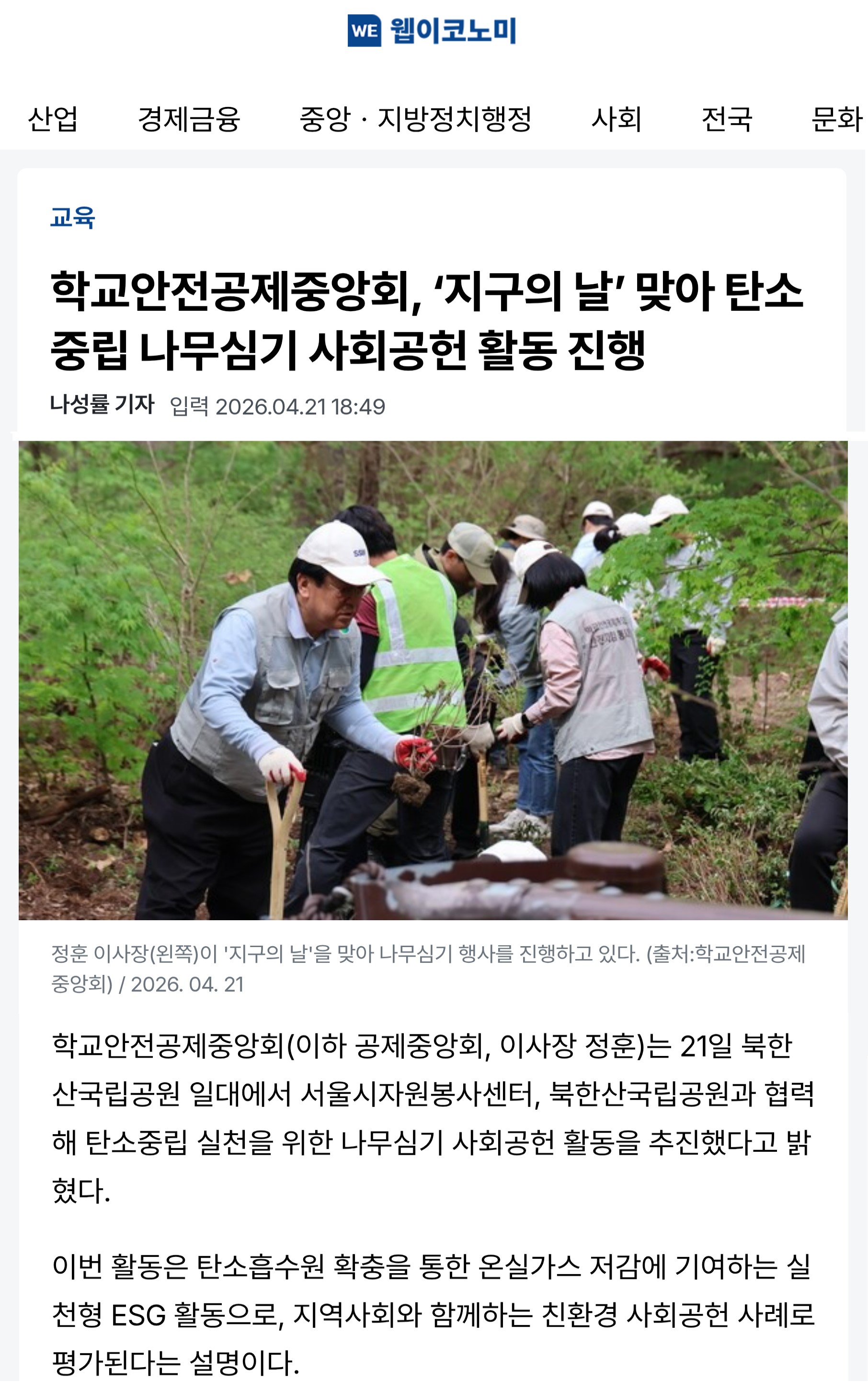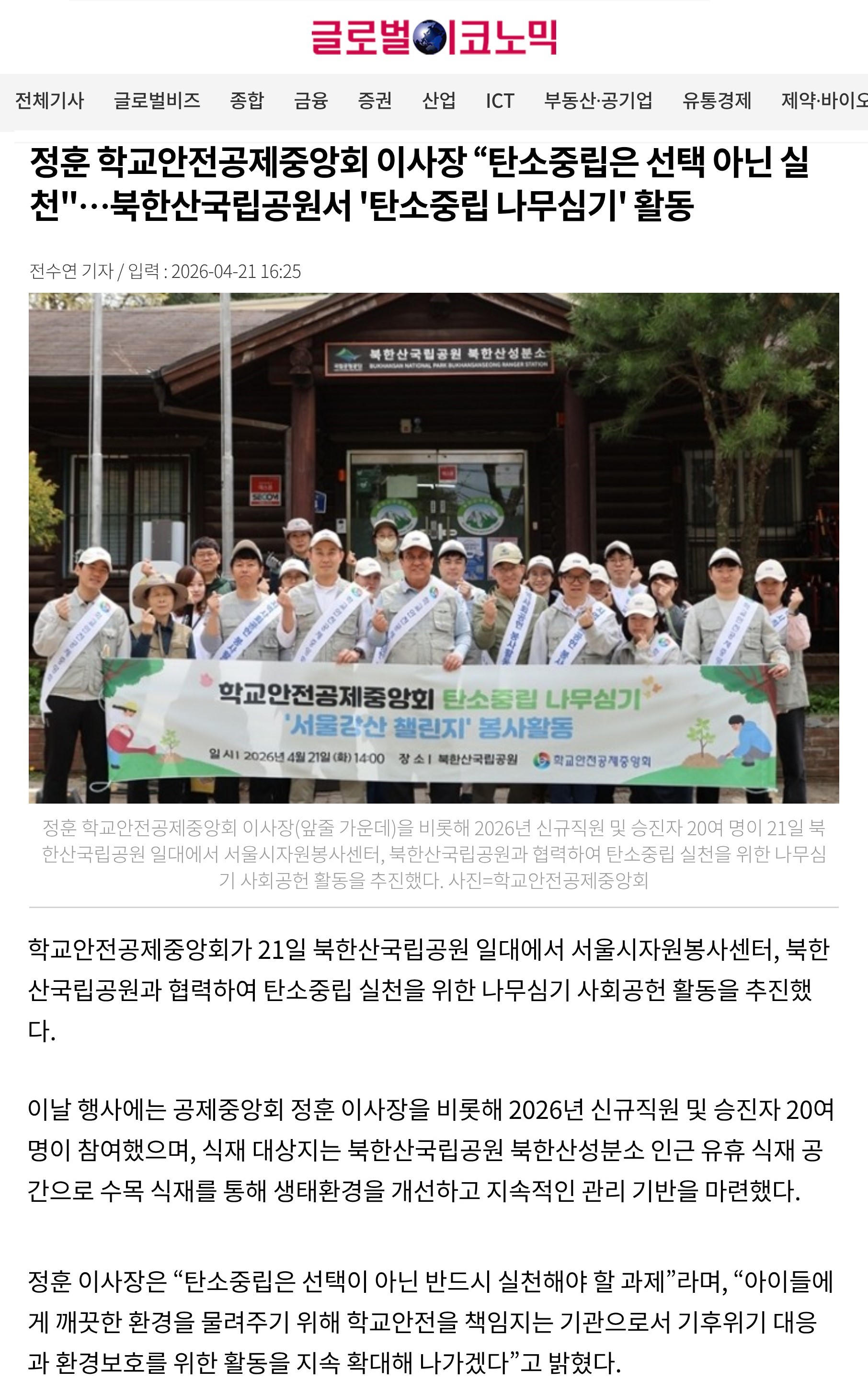 □ [글로벌이코노믹] (2026.04.21.) 정훈 학교안전공제중앙회 이사장 “탄소중립은 선택 아닌 실천"…북한산국립공원서 '탄소중립 나무심기' 활동 https://m.g-enews.com/view.php?ud=202604211625096630a9fc143920_1