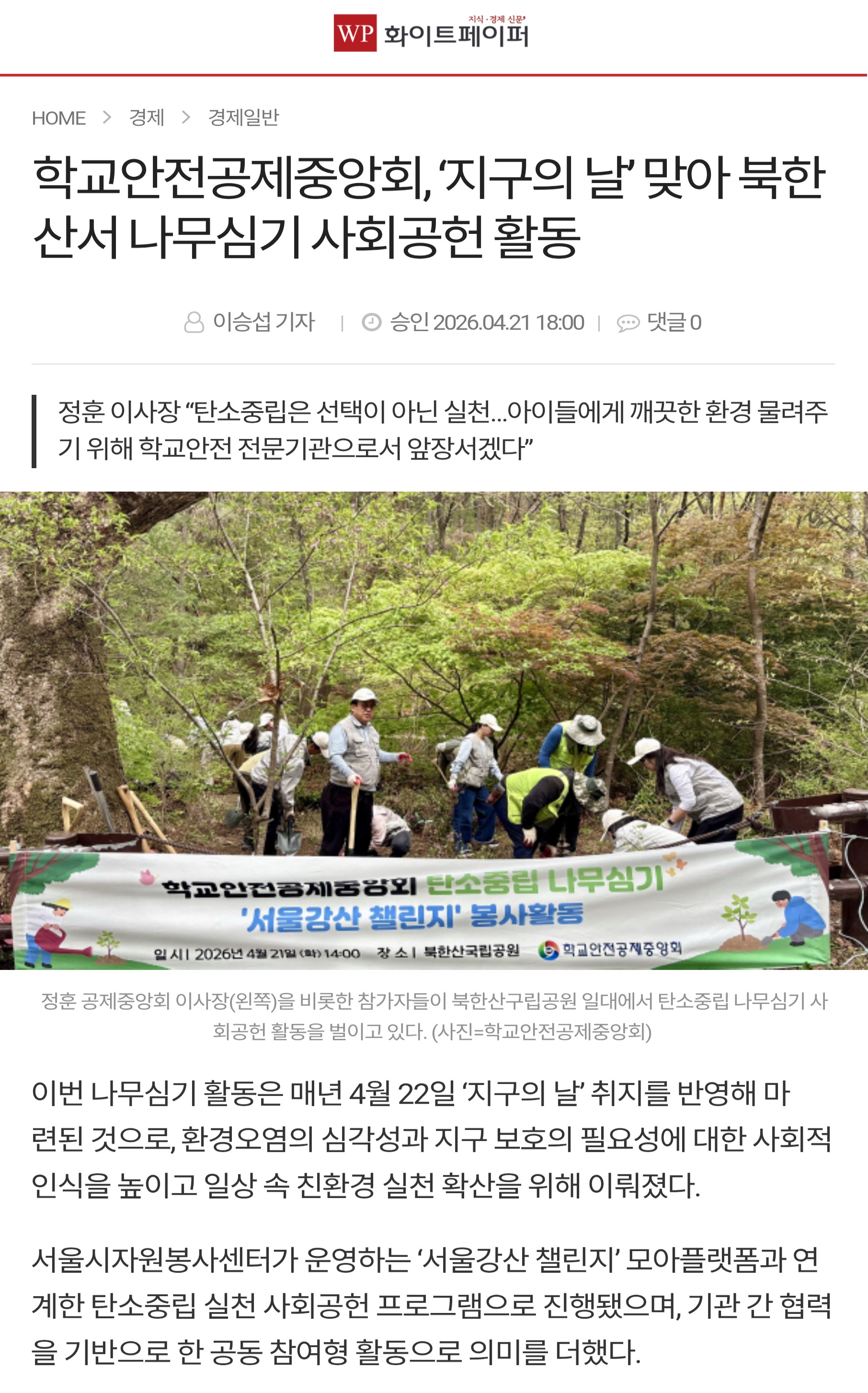 □ [화이트페이퍼] (2026.04.21.) 학교안전공제중앙회, ‘지구의 날’ 맞아 북한산서 나무심기 사회공헌 활동 https://www.whitepaper.co.kr/news/articleView.html?idxno=261378
