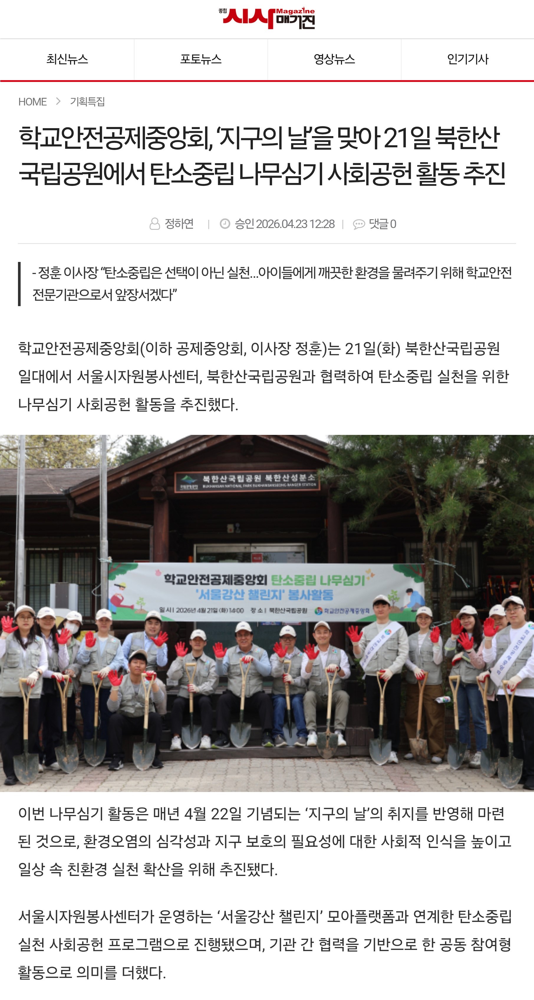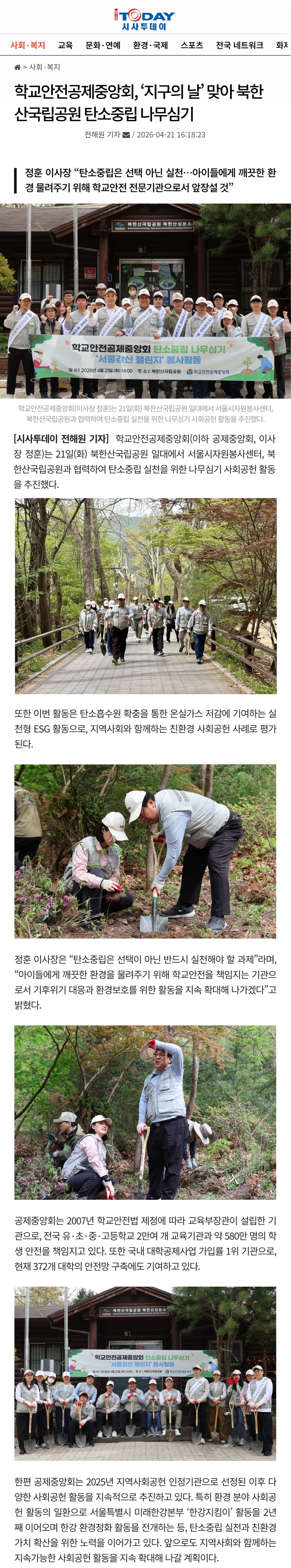 □ [시사투데이] (2026.04.21.) 학교안전공제중앙회, ‘지구의 날’ 맞아 북한산국립공원 탄소중립 나무심기 https://sisatoday.co.kr/article/1065597511714627