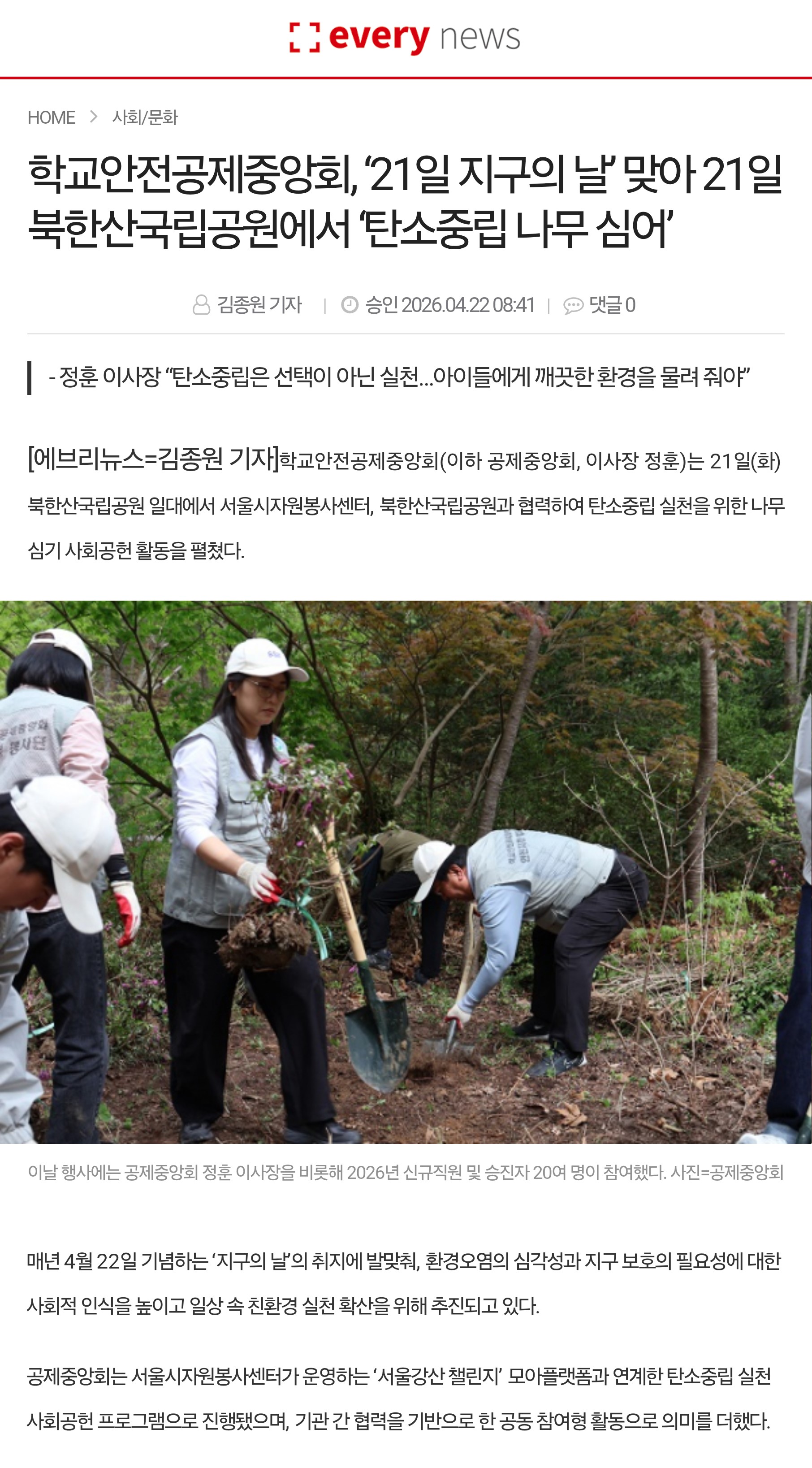 □ [에브리뉴스] (2026.04.22.) 학교안전공제중앙회, ‘21일 지구의 날’ 맞아 21일 북한산국립공원에서 ‘탄소중립 나무 심어’ http://www.everynews.co.kr/news/articleView.html?idxno=47972