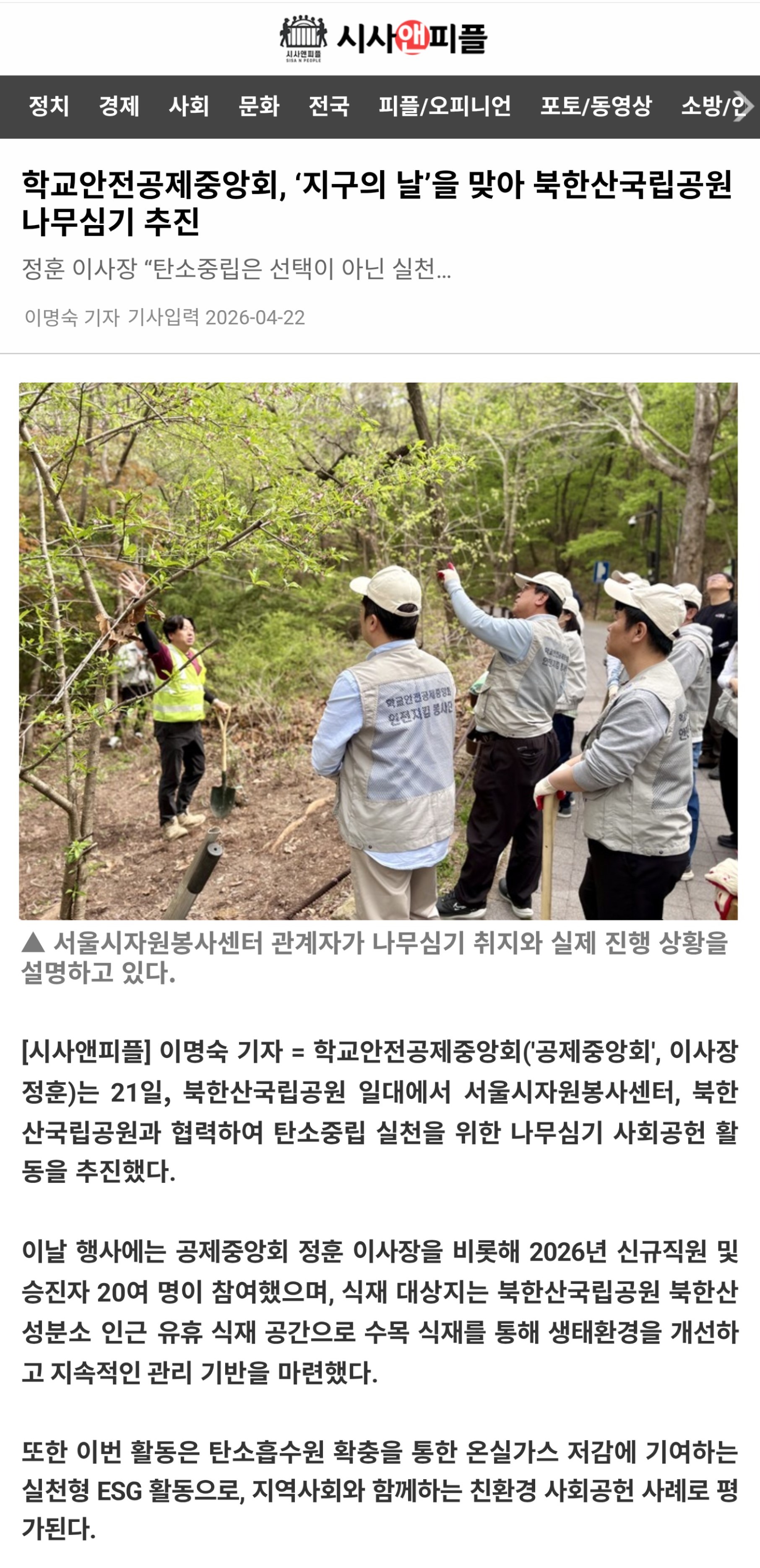 □ [시사앤피플] (2026.04.22.) 학교안전공제중앙회, ‘지구의 날’을 맞아 북한산국립공원 나무심기 추진 https://www.sisanpeople.com/14779